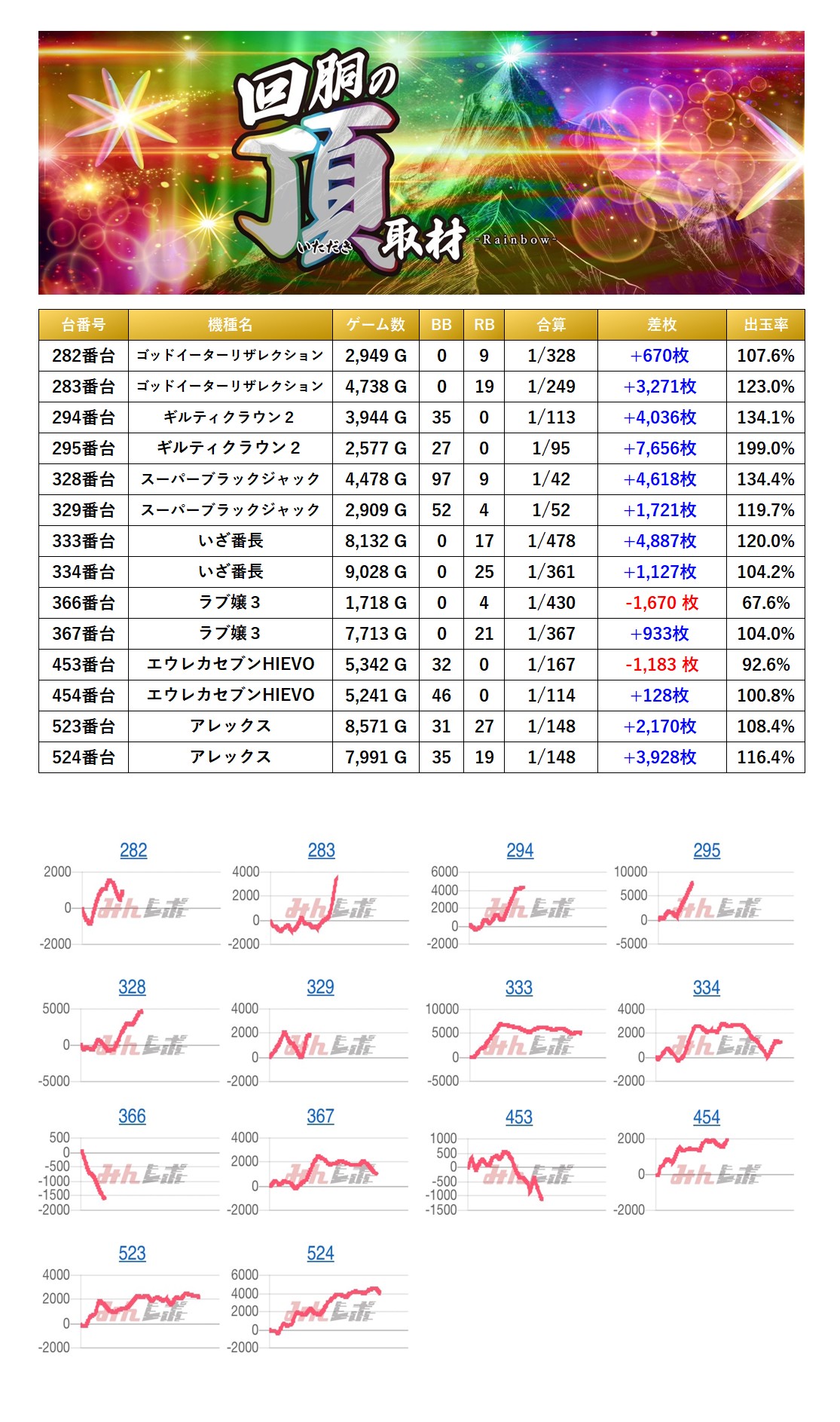 9箇所31台の平均差枚は+1,909枚で平均出率が111.1%と素晴らしい出玉だった。