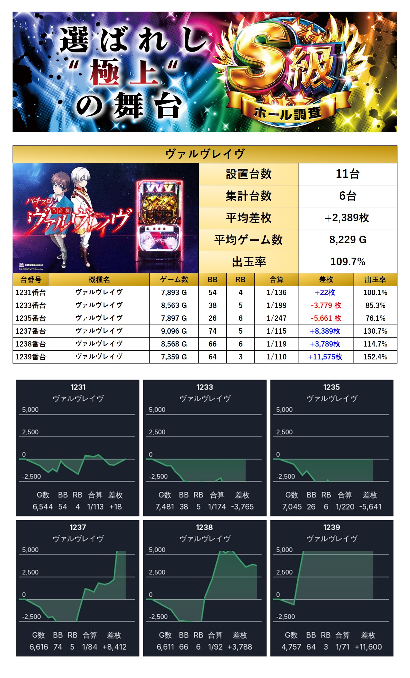 平均差枚は**+2,389枚**、平均出率**109.7%**と安定感のある仕上がりを見せた。