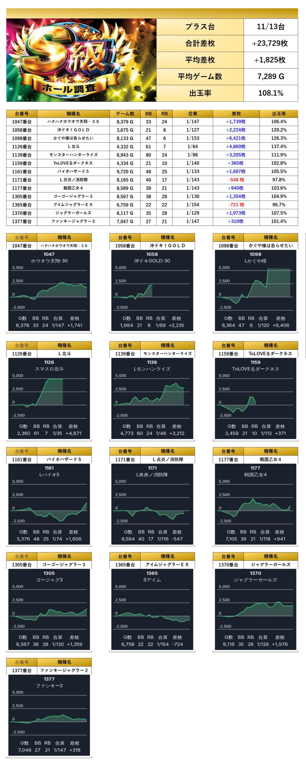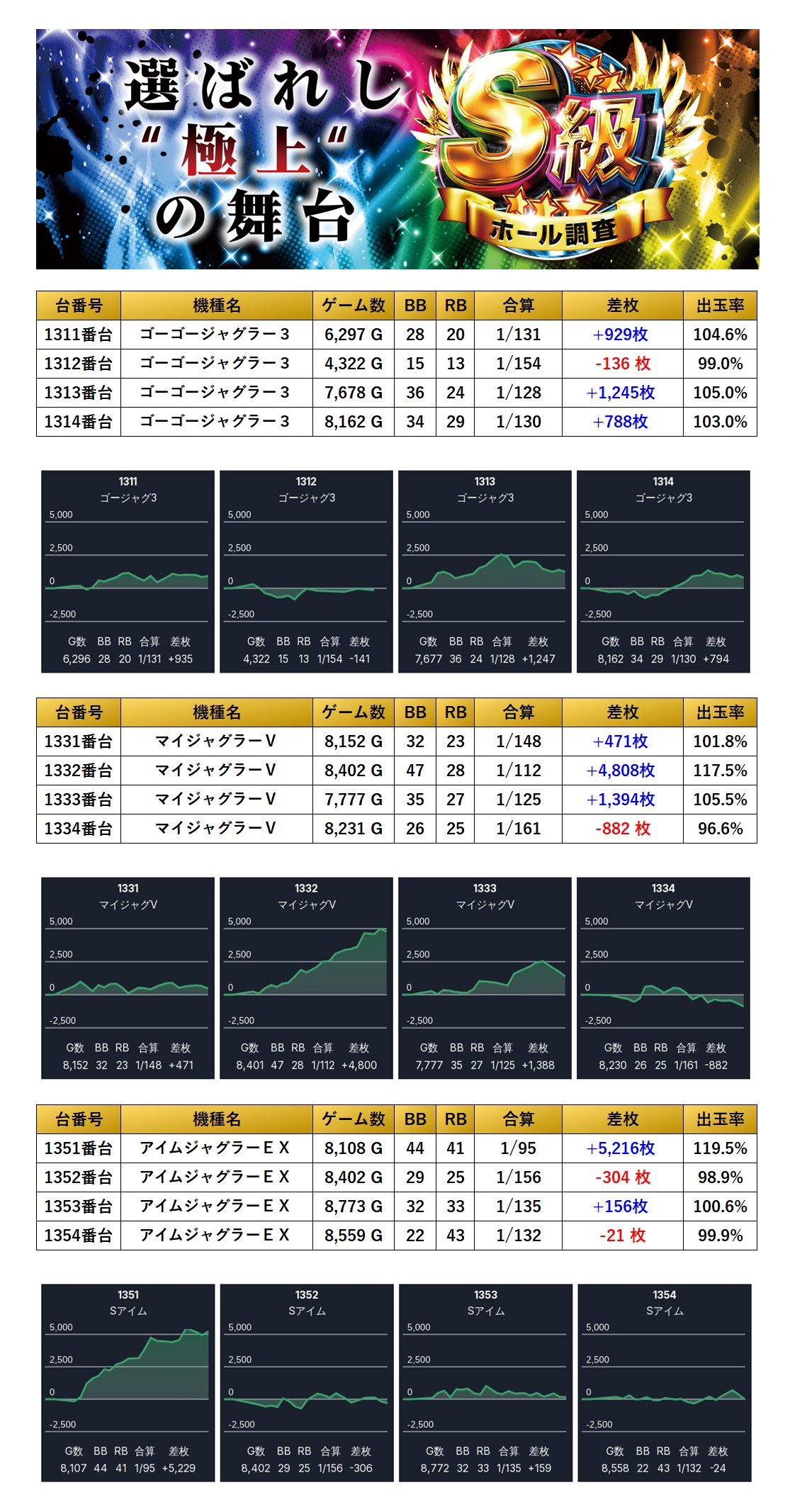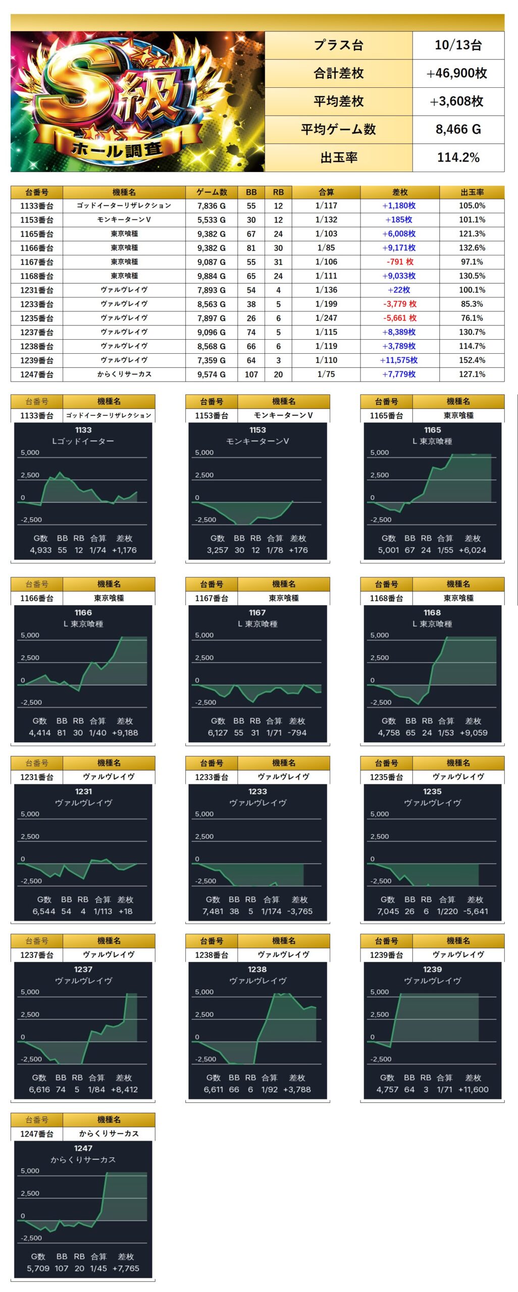 今回のS級虹・パラッツォ志津店は、特に全台が好調だった機種の出玉感が際立った結果となった。