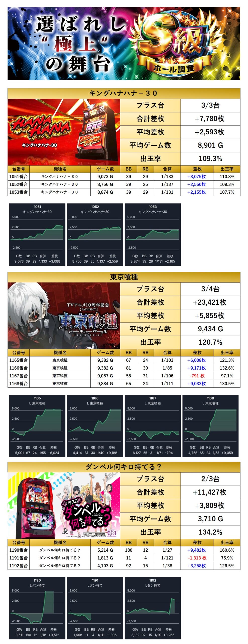 「キングハナハナ」「東京喰種」「ダンベル」の3機種全台をpick up。