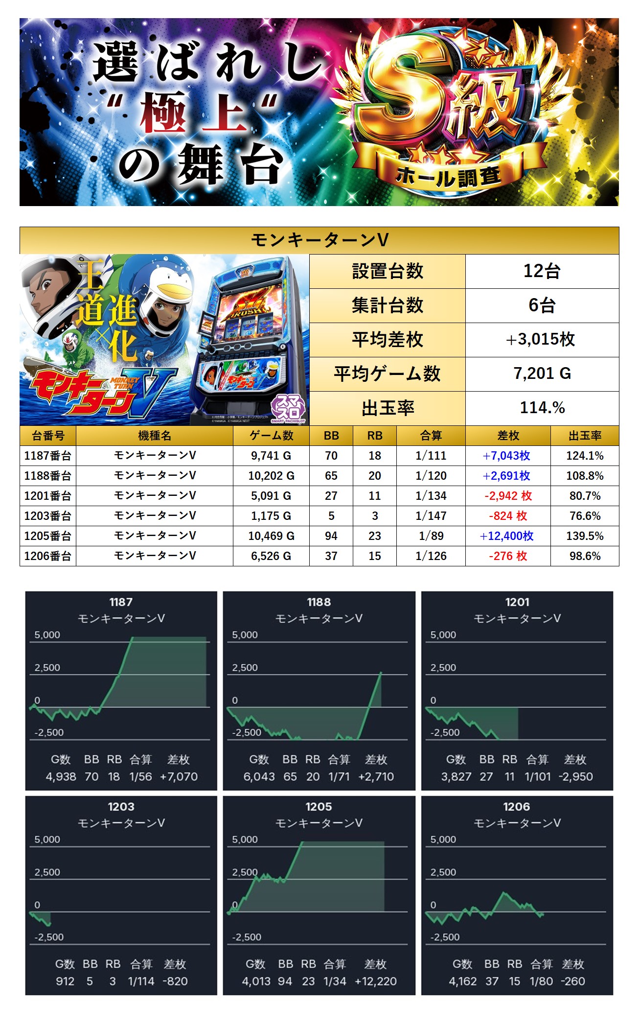 「モンキーターン」を筆頭に複数の仕掛けが好調台を生み出し、ホール全体として盛り上がりを見せた一方で、三ツ星評価に届くほどの圧倒的な出玉感までは見られなかった。