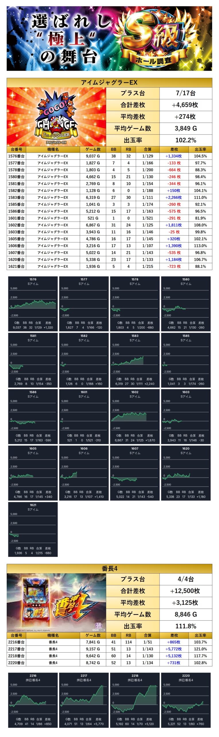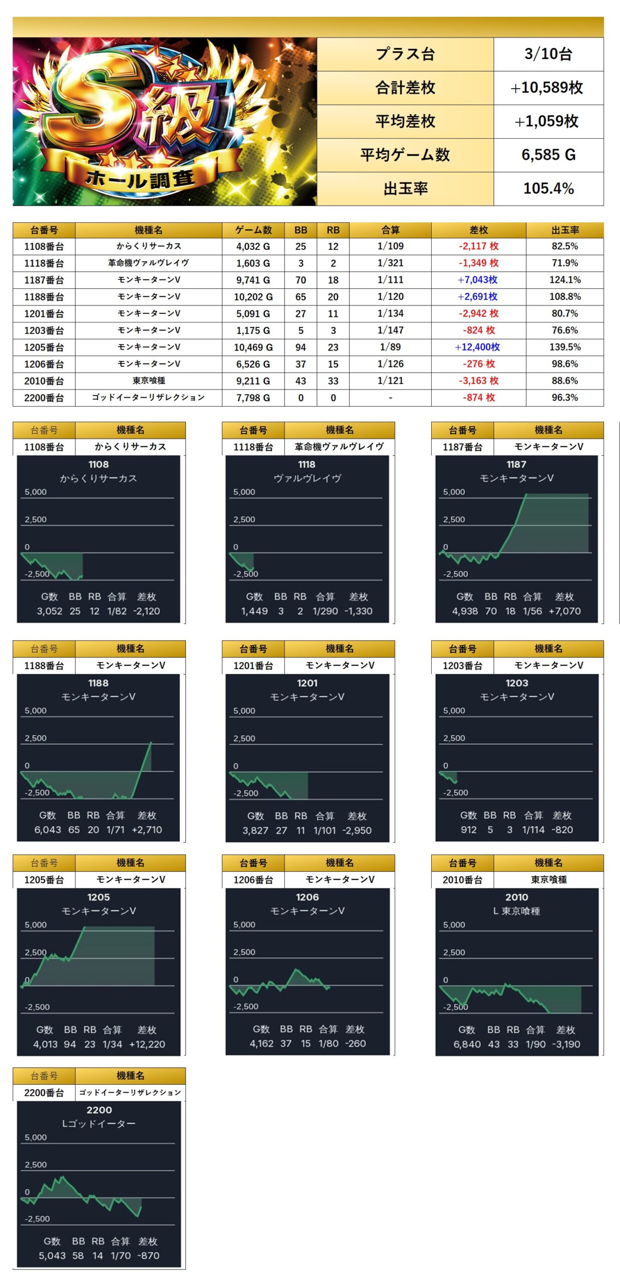 平均差枚は+1,059枚、平均出率105.4%と、着実にプラス結果を残しホール全体を下支えした。