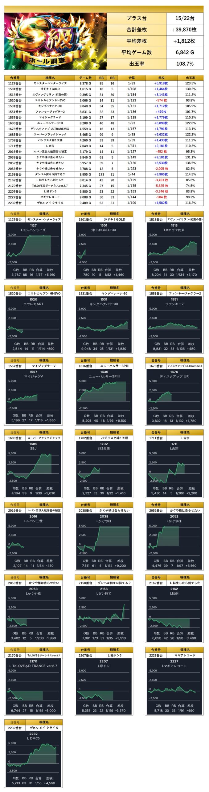 平均差枚は+1,498枚、平均出率106.7%と、並びとしての魅力をしっかり見せた。