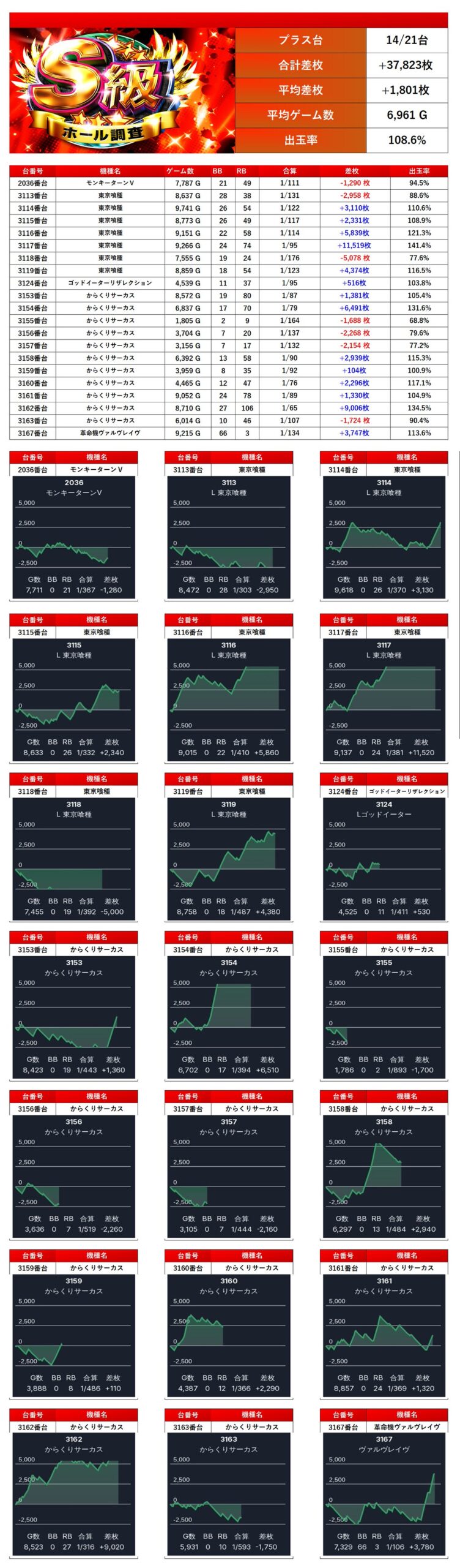 人気の5機種から合計21台がピックアップされ、平均差枚+1,801枚/出率108.6%を記録。全体として安定感のある内容を見せた。
