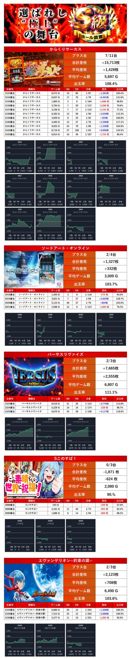上記でも取り上げたメイン機種の「からくりサーカス」が全台系となり、ホールの盛り上がりを象徴する存在に。平均差枚は+1,040枚/出率106.7%と堅実な結果を残した。