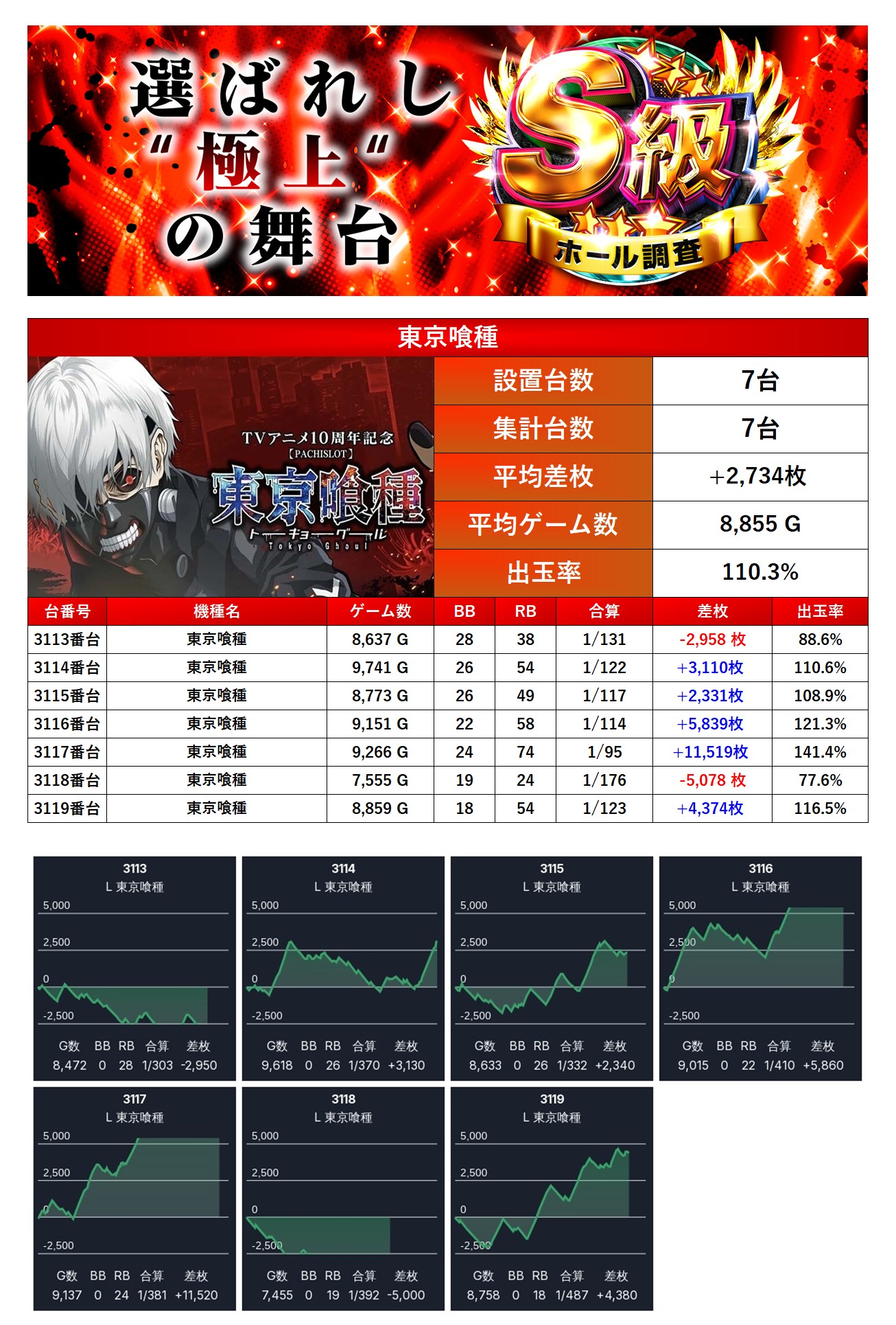「からくりサーカス」の全台系や「東京喰種」のニブイチといったメイン機種が要所で存在感を発揮しつつ、2台設置以下の機種でも強い結果が確認できた点が印象的。