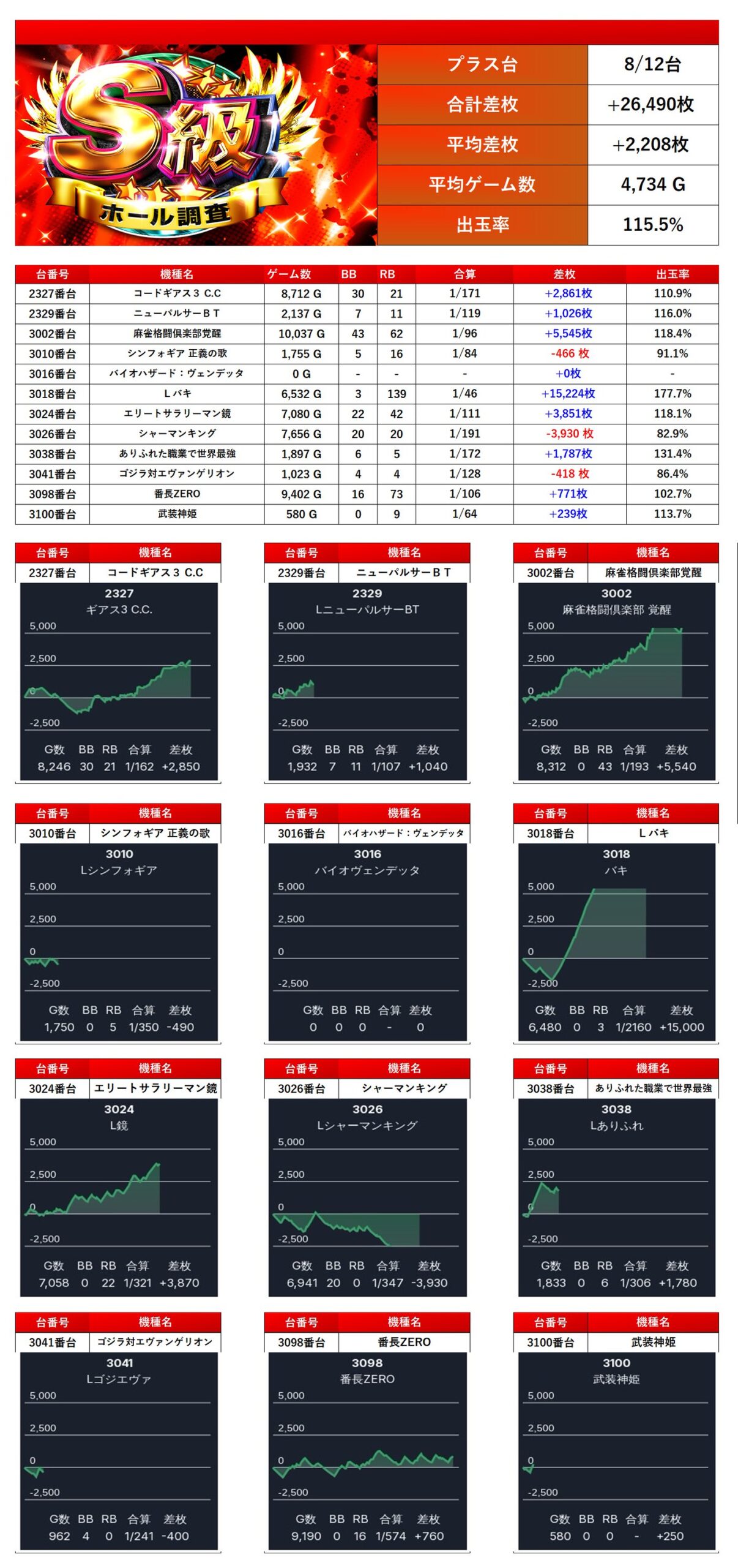 「コードギアスCC」「鏡」「麻雀格闘倶楽部」などが美しい右肩上がりのグラフを描き、平均差枚+2,208枚/出率115.5%を記録。バラエティにもチャンスのある店内ということが伝わってきた。