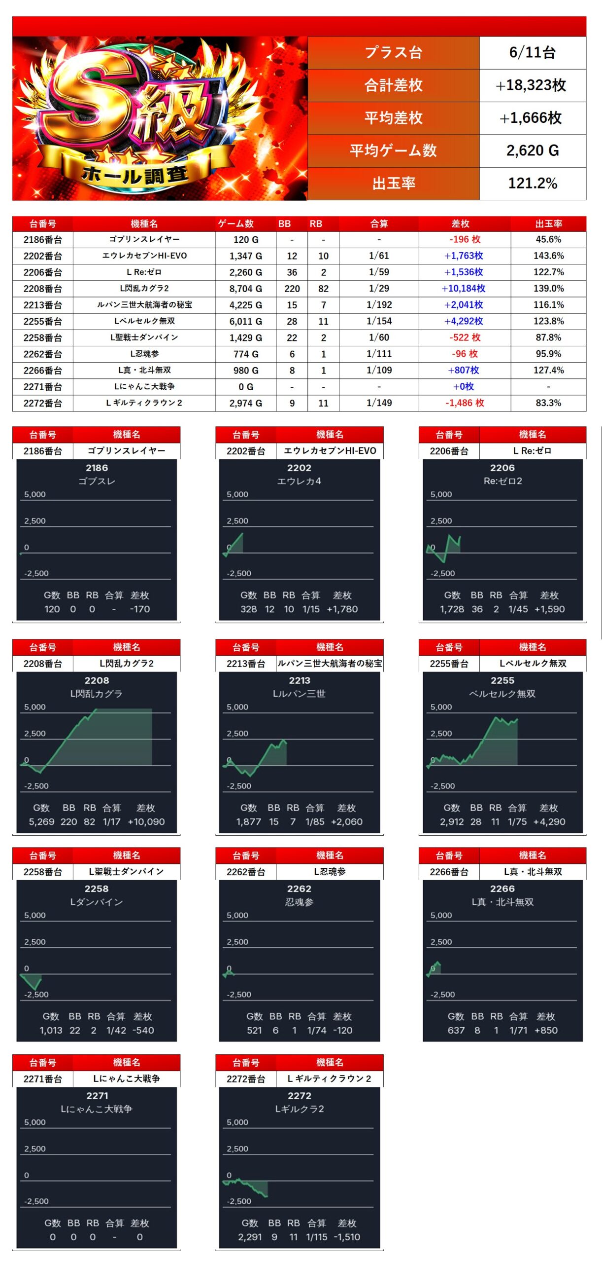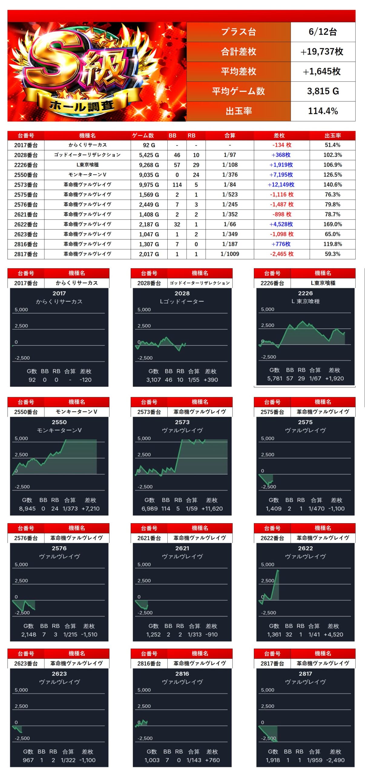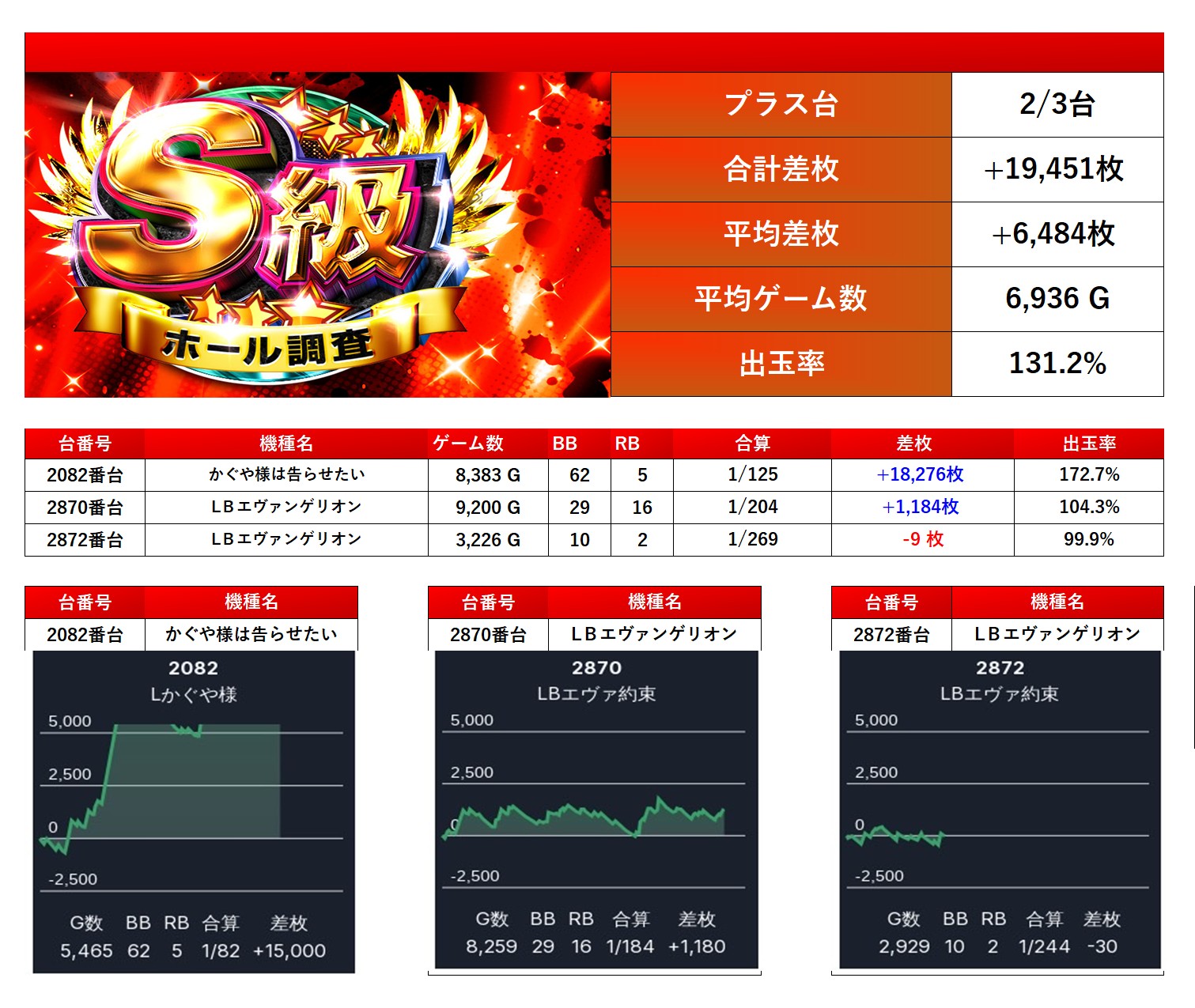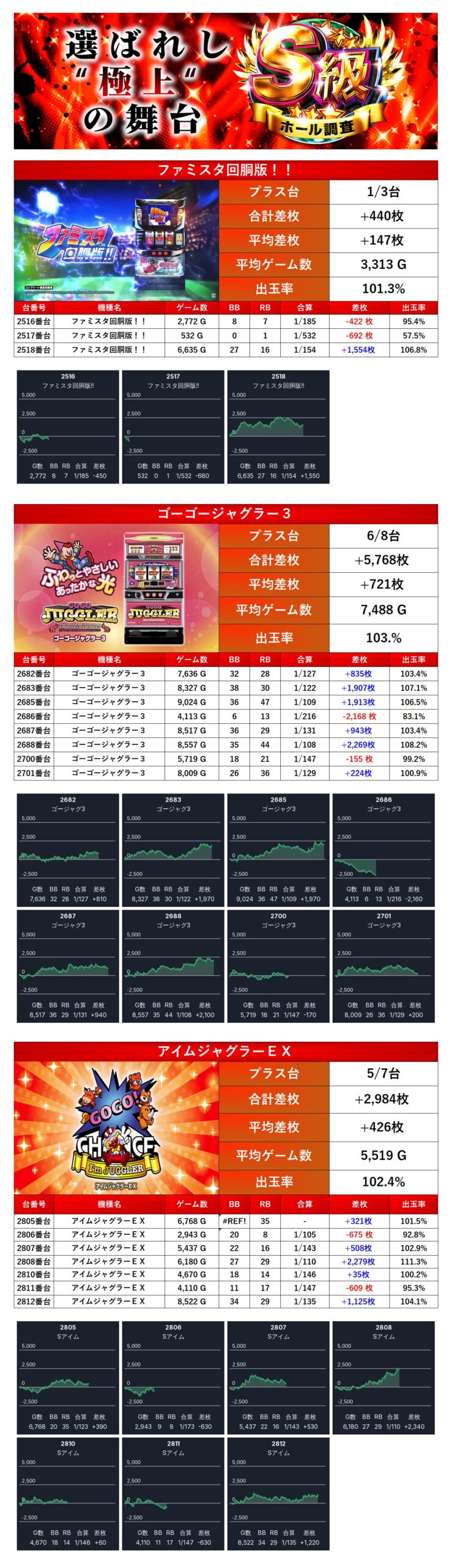 今回のS級調査-赤-は、単品の強烈な出玉が特に目を引いた回となった。