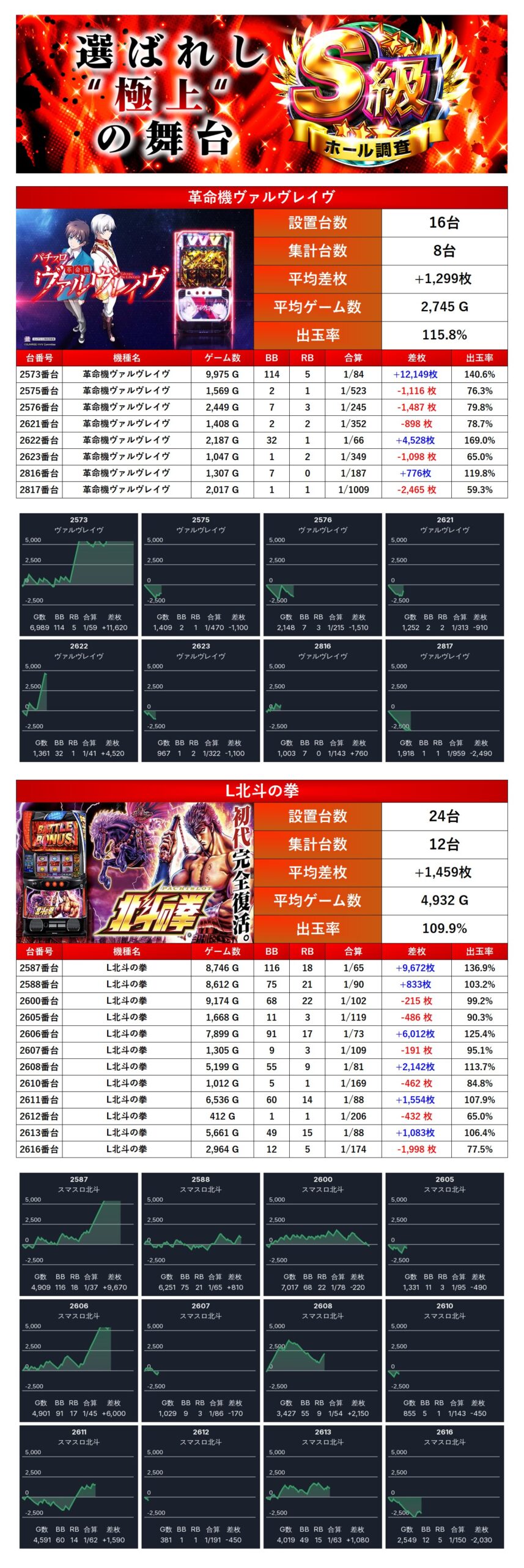 今回は「ヴヴヴ」と「北斗」が該当し、平均差枚+1,395枚/出率111.5%という結果。