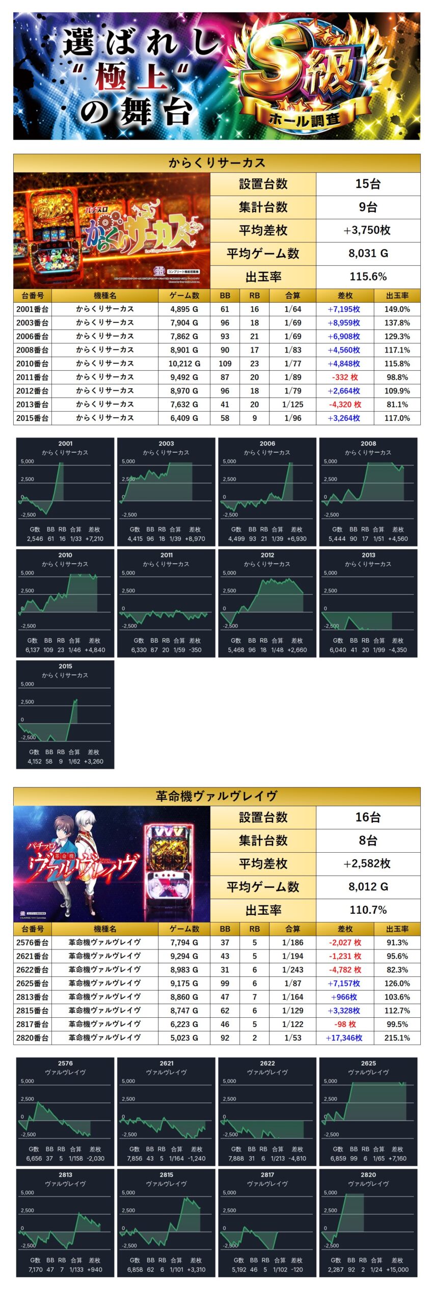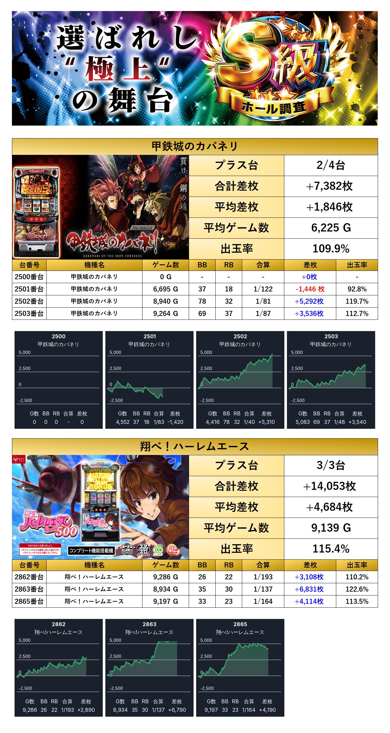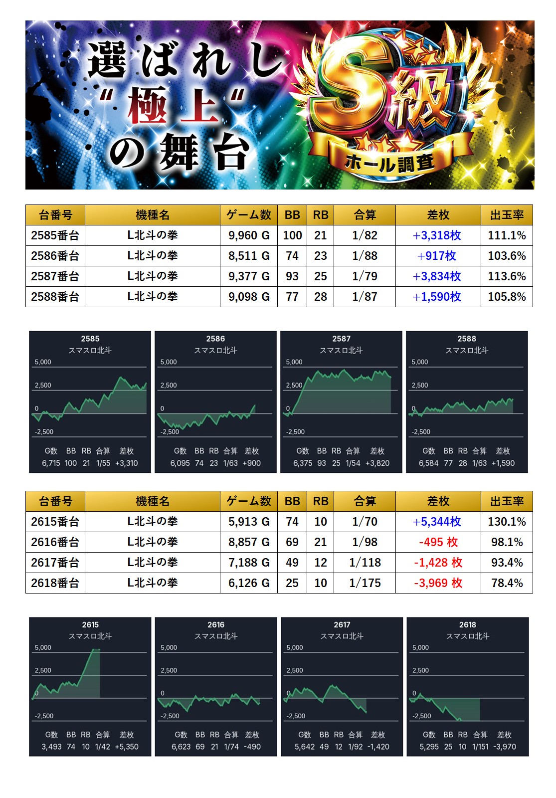 今回のS級ホール調査-虹-は、全体を通して高い盛り上がりを確認する事が出来た。総差枚+71,808枚/平均+187枚 の記録を叩き出してくれた。さらに全体の17.7%がpick upされており、「人気機種からの仕掛け」や「ニブイチの東京喰種」や「全台好調な機種」が強さを発揮しつつ、「並び」や「4台設置機種」にも広くチャンスが散りばめられており、仕掛け数も充実していた。まさにホール全体が勝負できる空気に包まれていたと言える。総じて、稼働・出玉・盛り上がりの三拍子が揃った好内容であり、文句なしの「三つ星評価」にふさわしい一日となった。