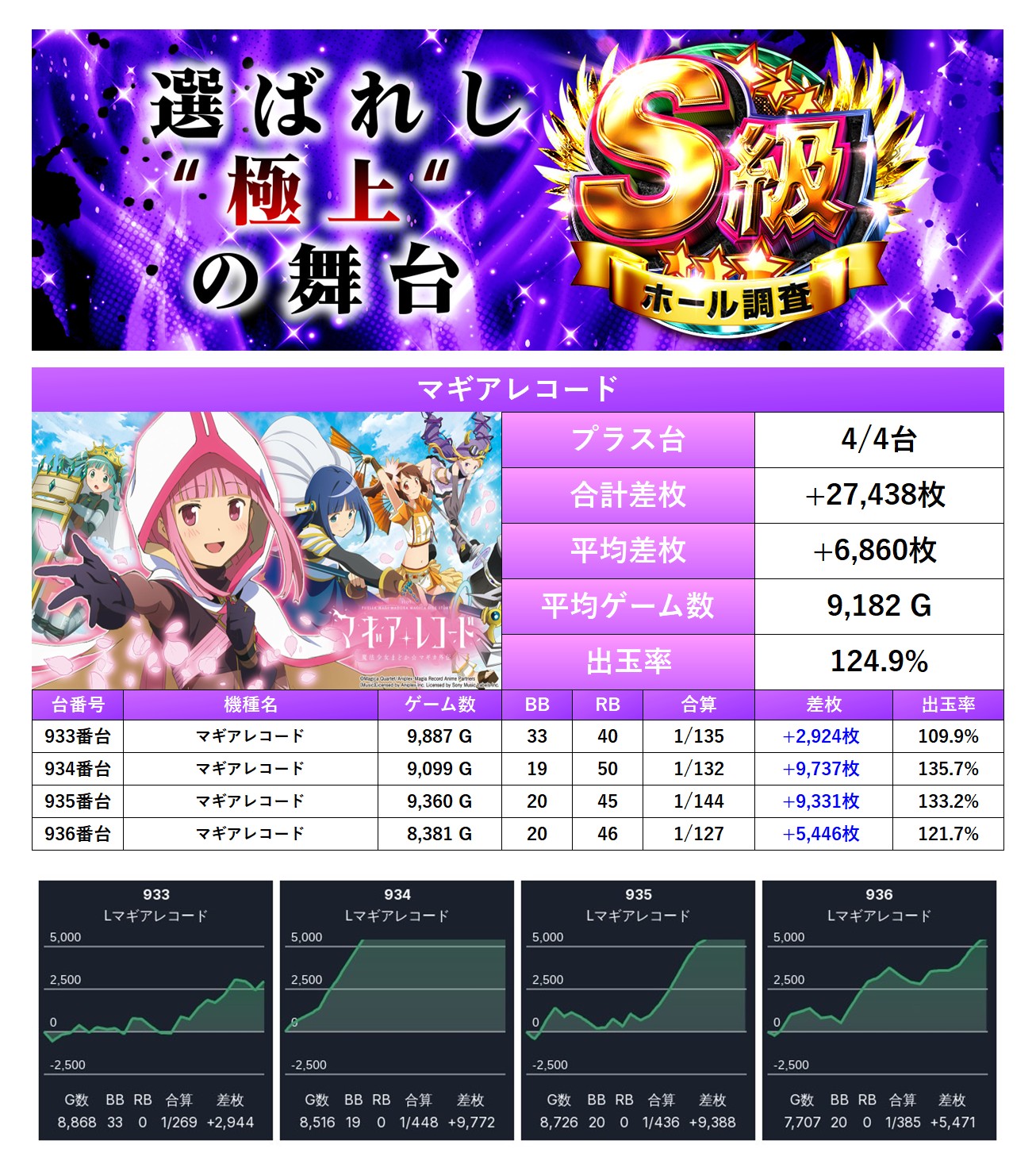 平均差枚+6,860枚、平均出率124.9%となった。平均ゲーム数が9,000G超えは圧巻だ。