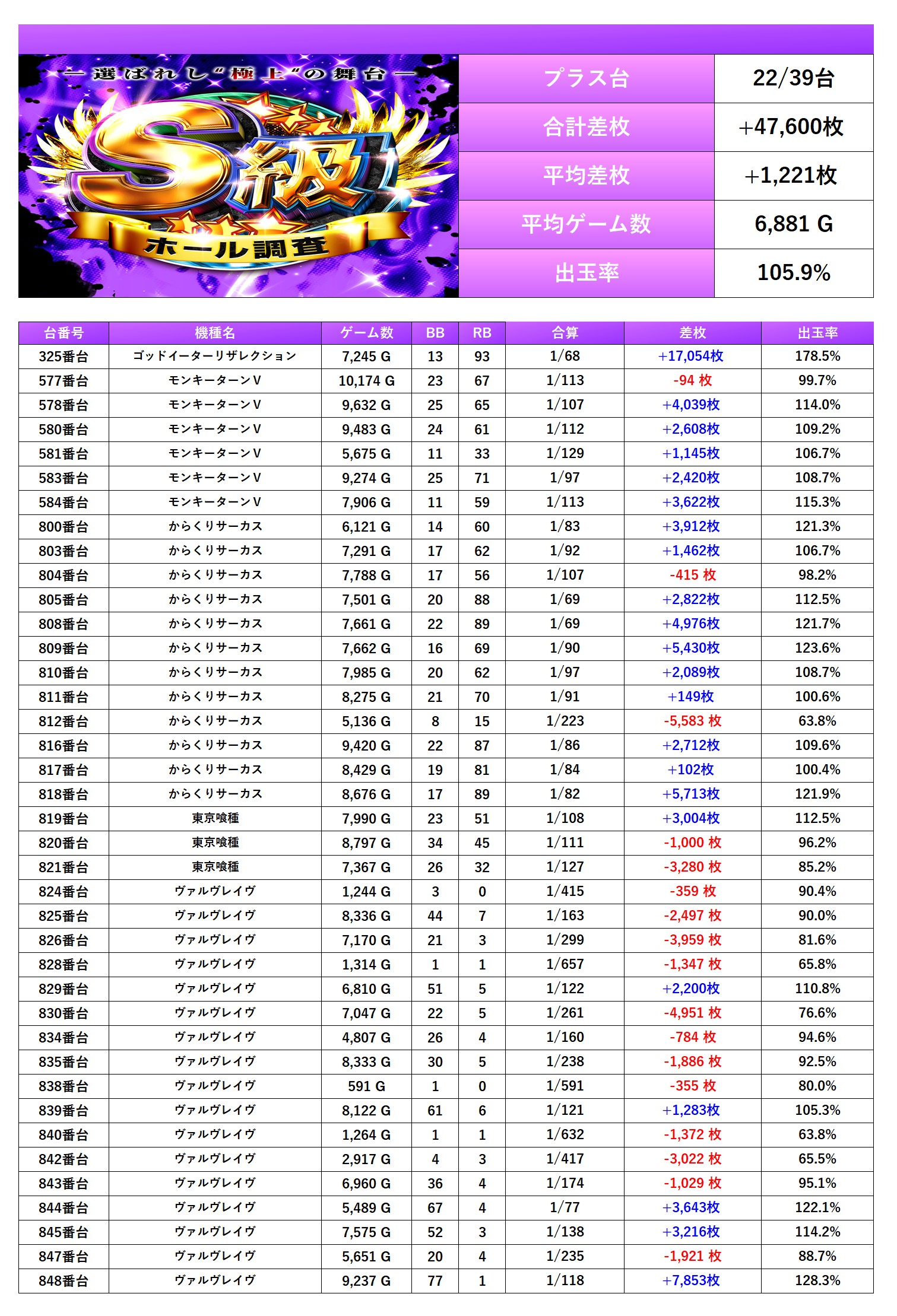 平均差枚+1,221枚、平均出率105.9%と平均ゲーム数も6,800G超えと素晴らしい。