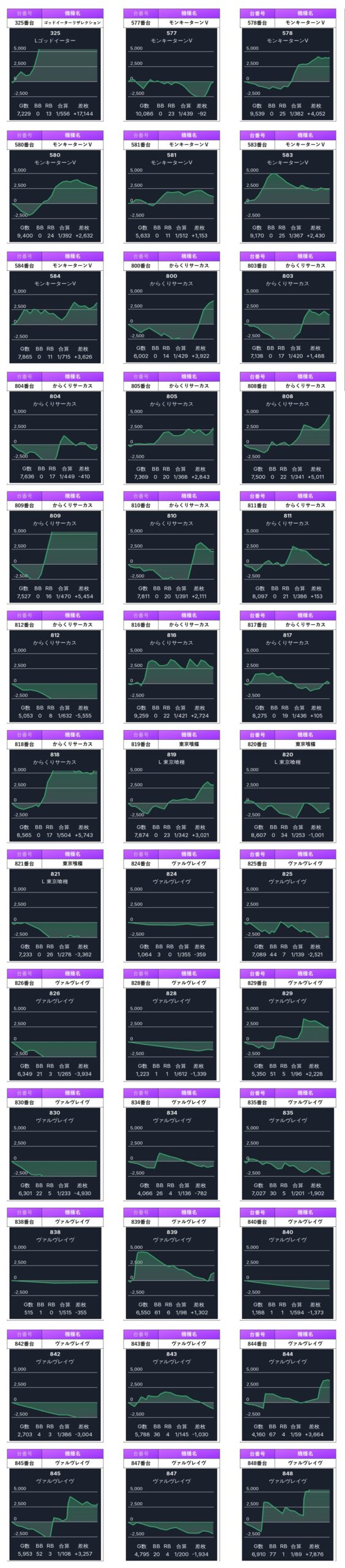 5回目となるS級調査-紫-の見どころは圧倒的な仕掛けの量だ。20スロ台数390台の35.3%がpick upなのである。1/3以上ならもはや座れればどうにかなるレベルである。どんな抽選番号でも戦える環境は素晴らしい。仕掛け全体の出率は106%であったので惜しくも二ツ星評価となるが次回調査も楽しみな内容であった。