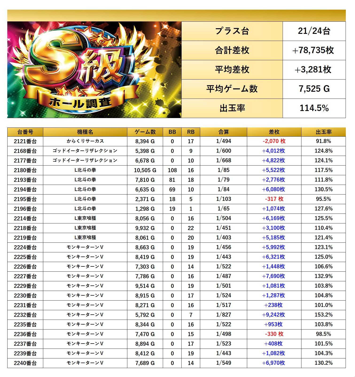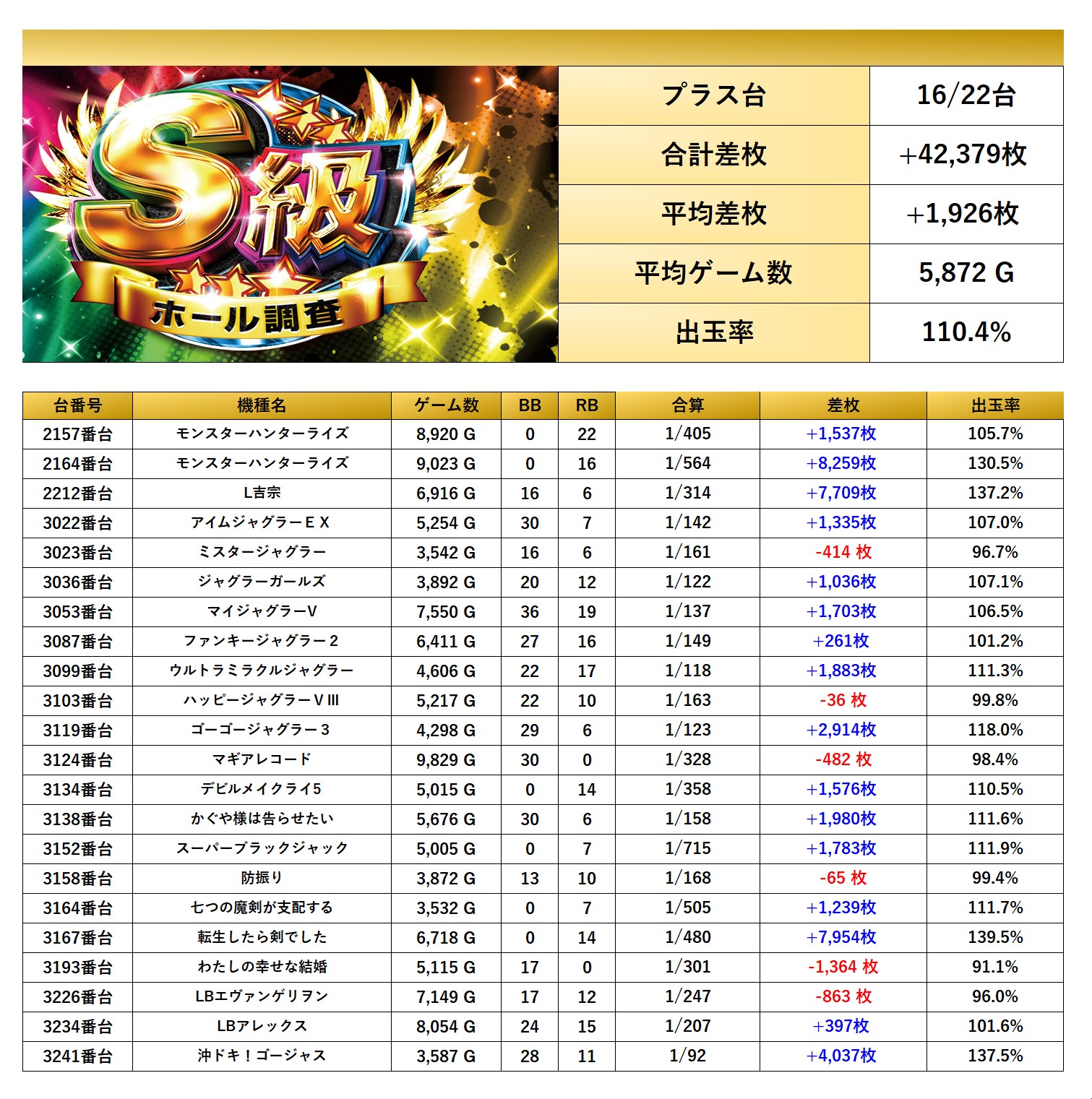 平均差枚+1,926枚、平均出率110.4%となった。モンハン、吉宗、マギレコと人気機種が登場し8,000G以上も動いている。どの機種もしっかり追える状況であったのがうかがえる。