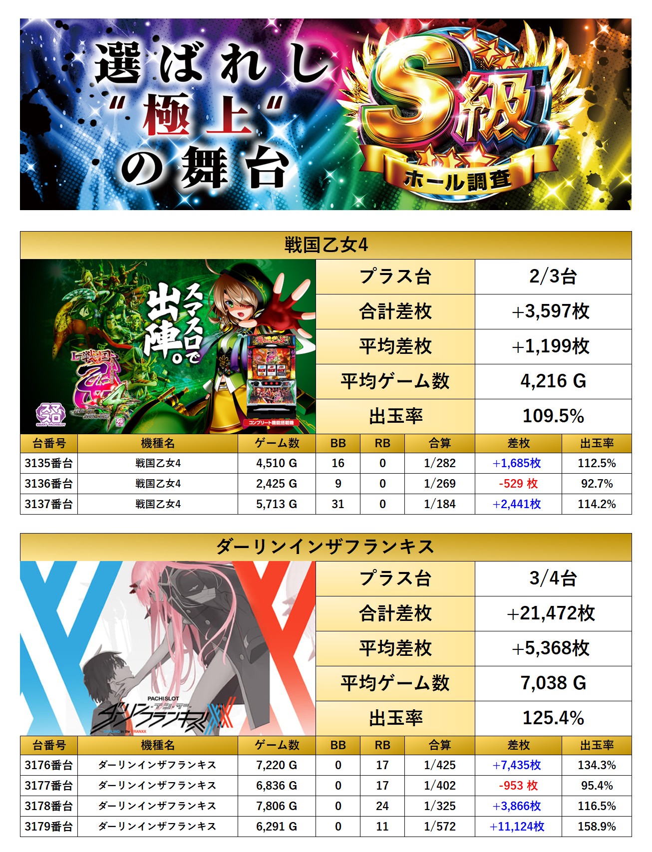 平均差枚+3,581枚、平均出率120.5%と、ダリフラが出率125.4%を叩き出し、なおかつ平均ゲーム数も優秀だ。