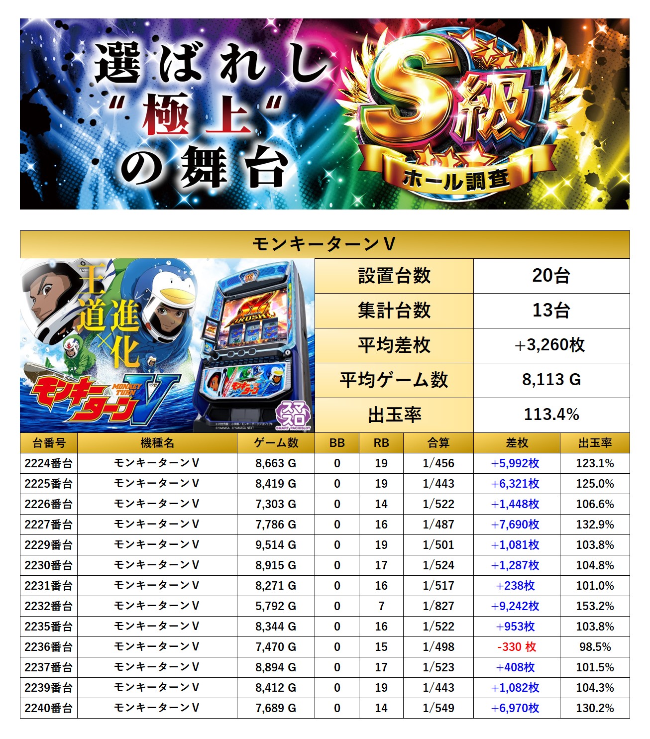 平均差枚+3,260枚、平均出率113.4%と、対象の13台はほぼ終日フル稼働で出率も高水準の数値だ。