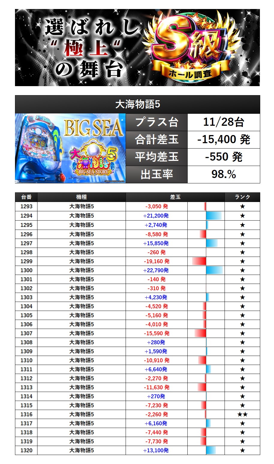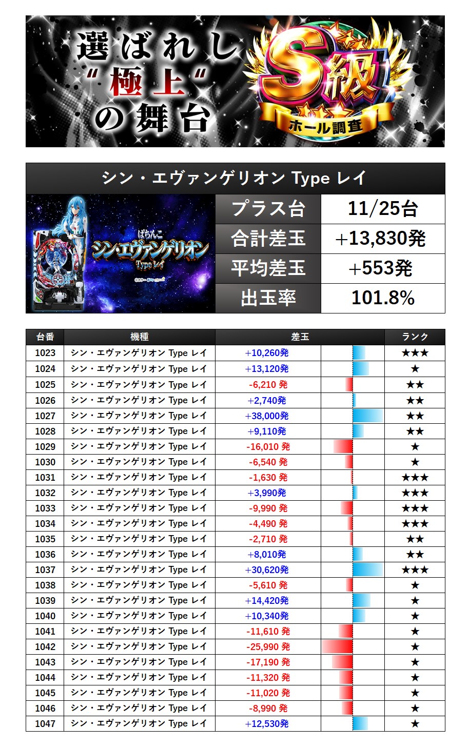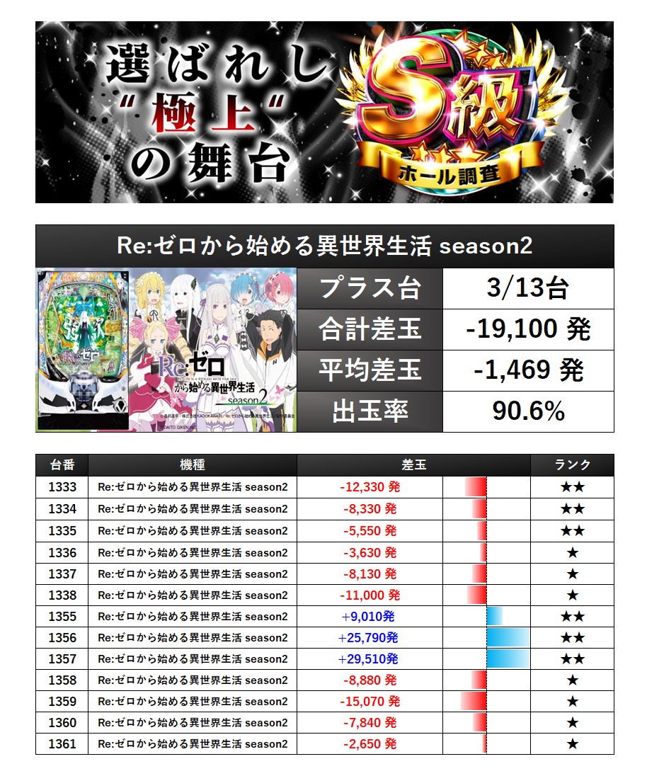 初開催のS級調査-黒-はパチンコの調査になる。注目機種は人気機種の3つになる。パチンコ全体の16.9%がpick upされ、出玉は惜しくも伸び悩んだものの、終日粘るユーザーの姿が目立った。総差枚玉こそマイナス域ではあるが終始稼働がついており「遊戯の楽しさ」を感じさせる雰囲気に包まれていた。次回の調査では期待している。
