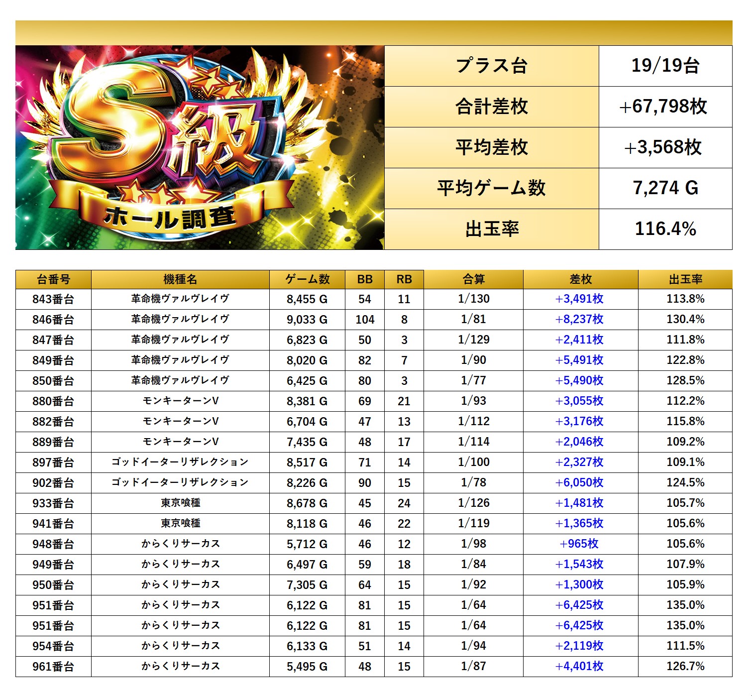 19台の平均差枚は+3,568枚で、平均出率は116.4%となった。