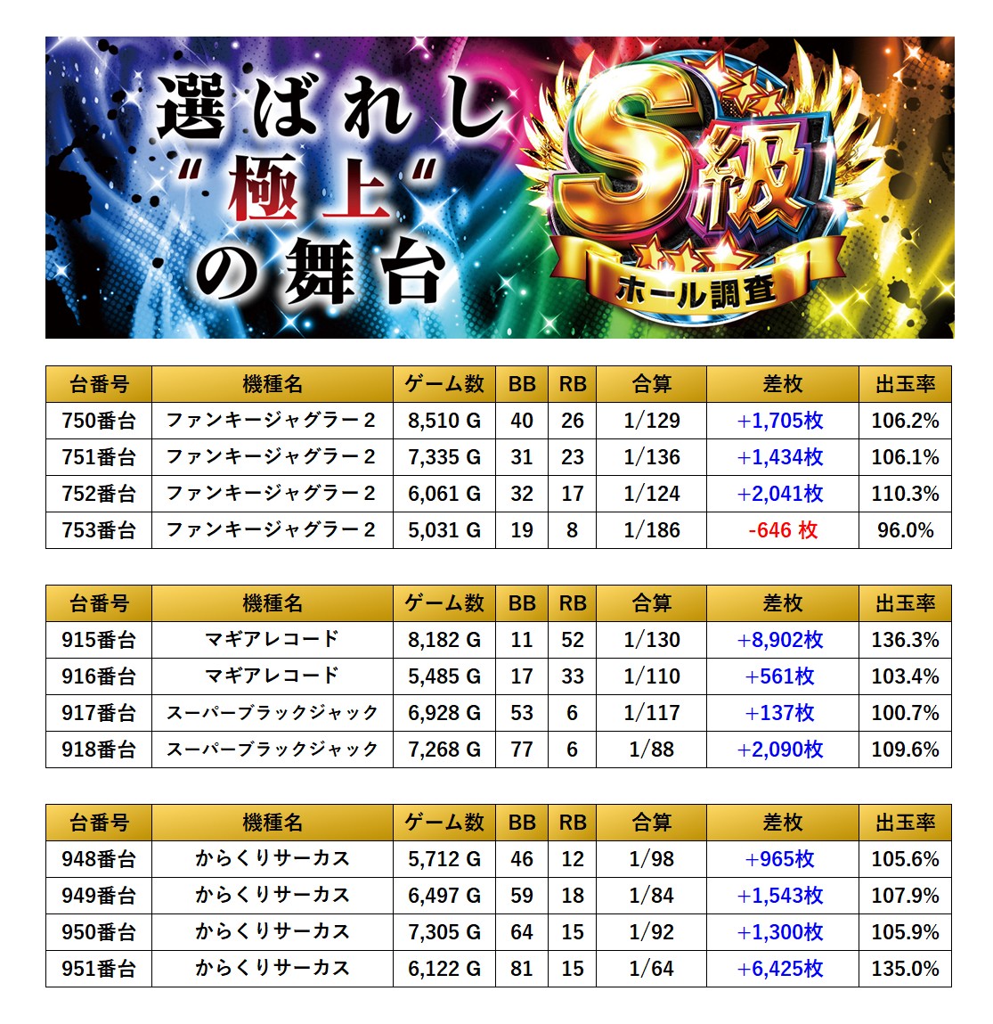 3箇所4台の並びをpickup。平均差枚は+2,205枚、平均出率は110.7%まとまった出玉感を演出した。