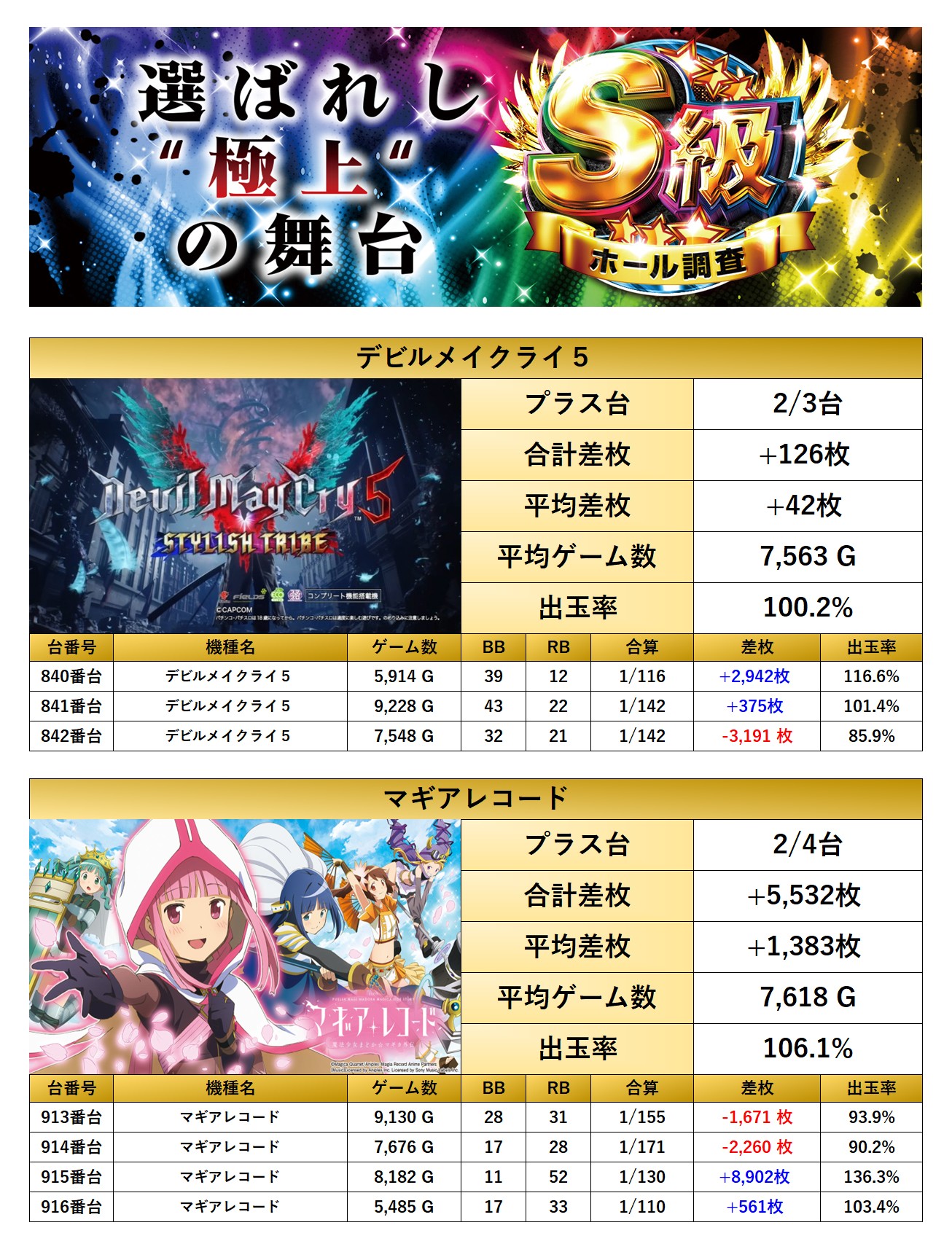 「DMC5」「マギレコ」の2機種7台をpickup。平均差枚は+808枚、平均出率は103.5%となった。