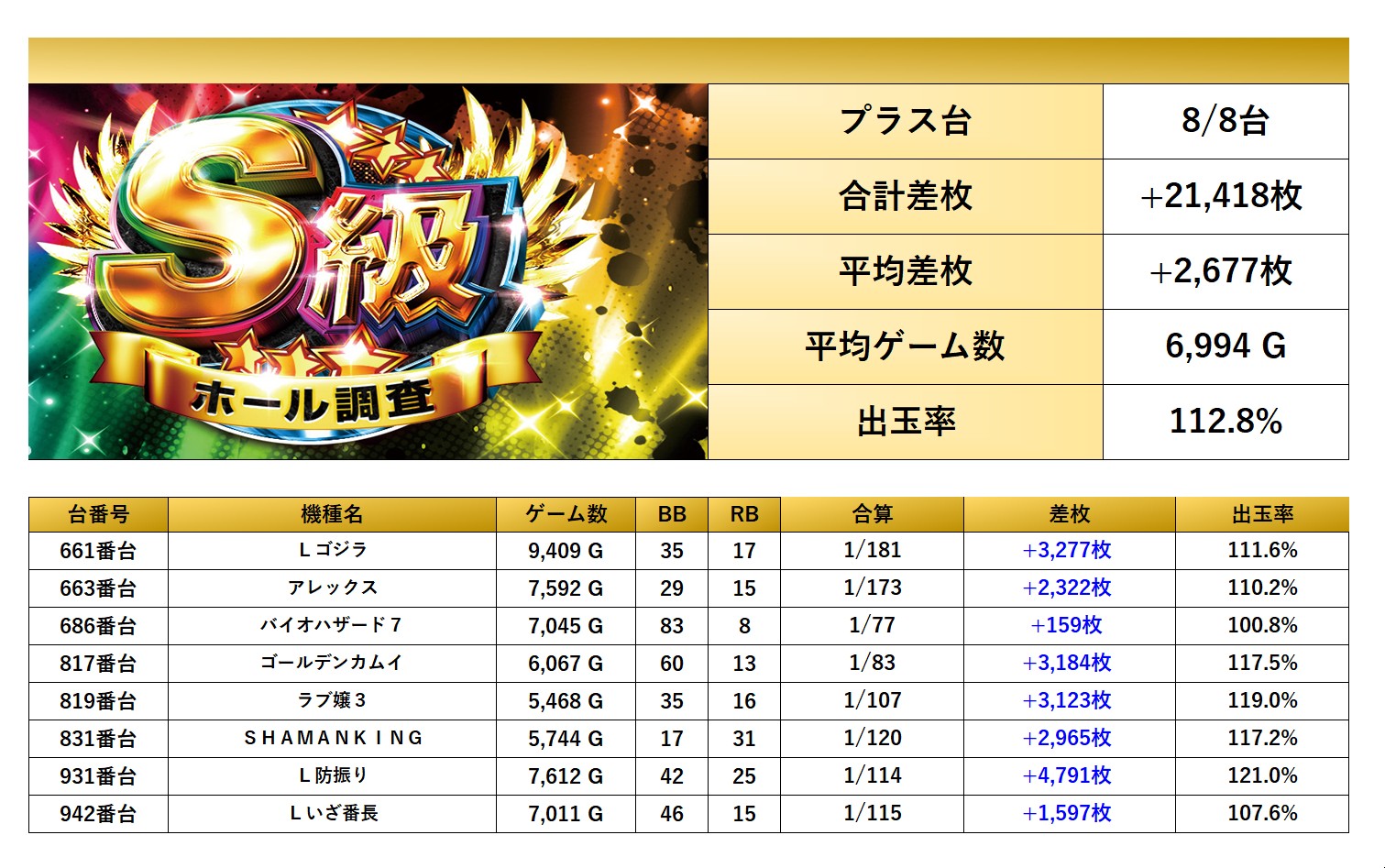 ・1台あたりの平均差枚数+2,603枚(平均出率112.1%)