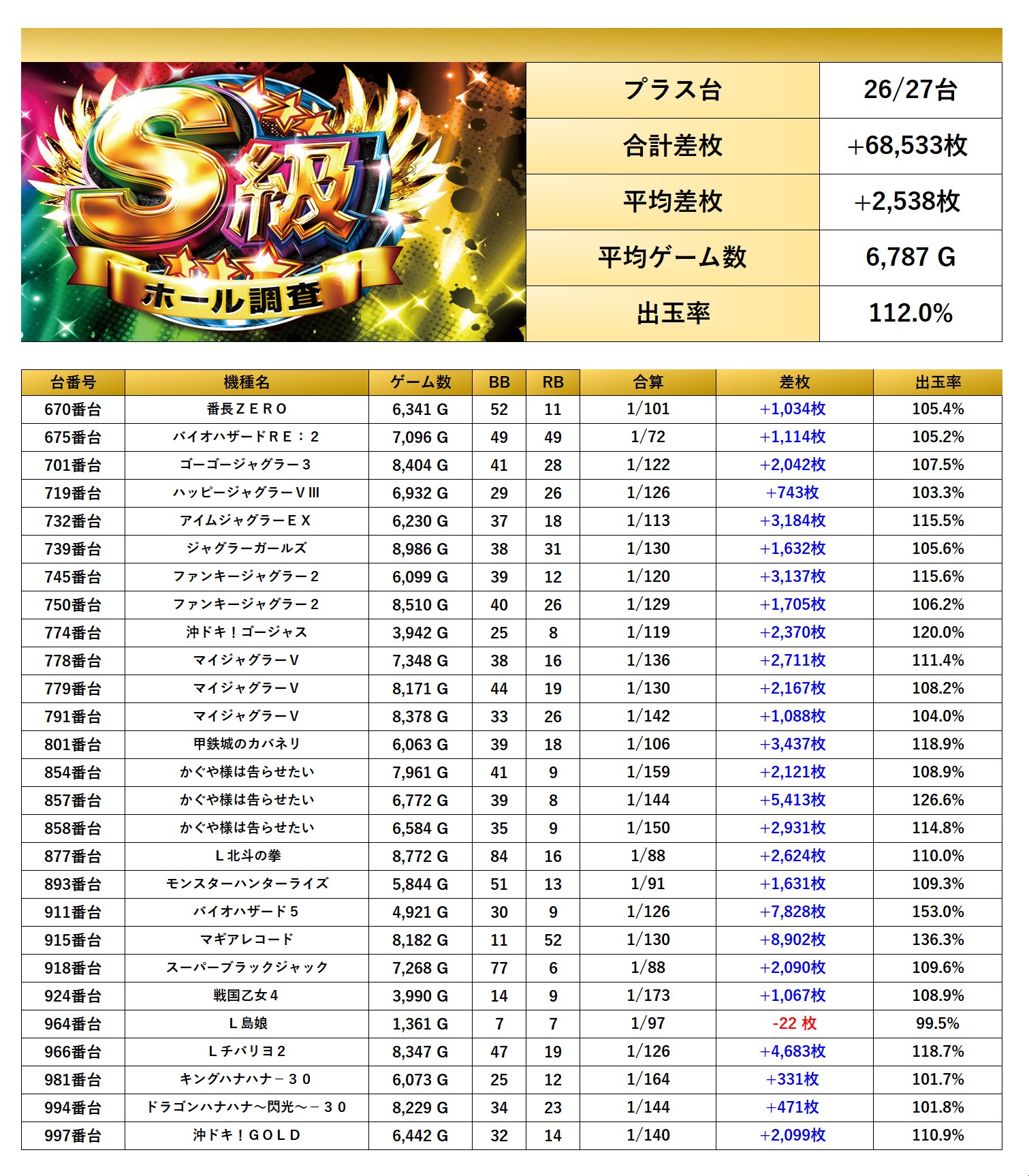 4台以上設置機種から27台の優秀台をピックアップ。平均差枚は+2,538枚、平均出率は112.0%と優れた数値をマーク。