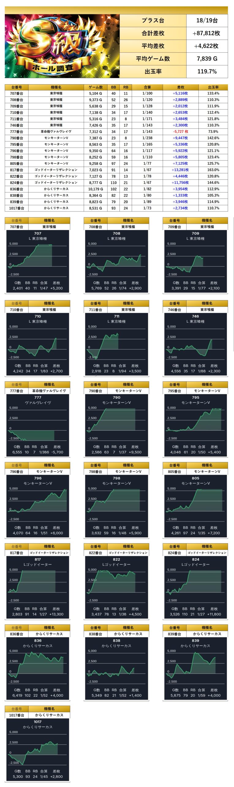 「東京喰種」「からくり」「モンキー」「ゴッドイーター」「ヴヴヴ」の5機種から19台の優秀台をpick upする。19台の平均差枚は+4,622枚で平均出率が驚異の119.7%だった。