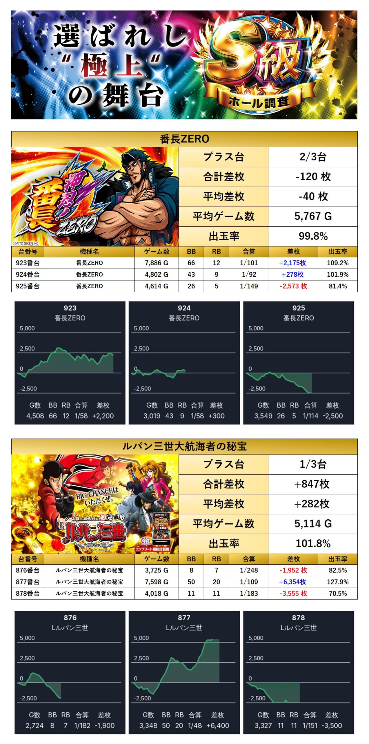 「ルパン三世大航海者の秘宝」「番長ZERO」の2機種をpick upする。2機種6台の平均差枚は+121枚で平均出率が100.7%だった。