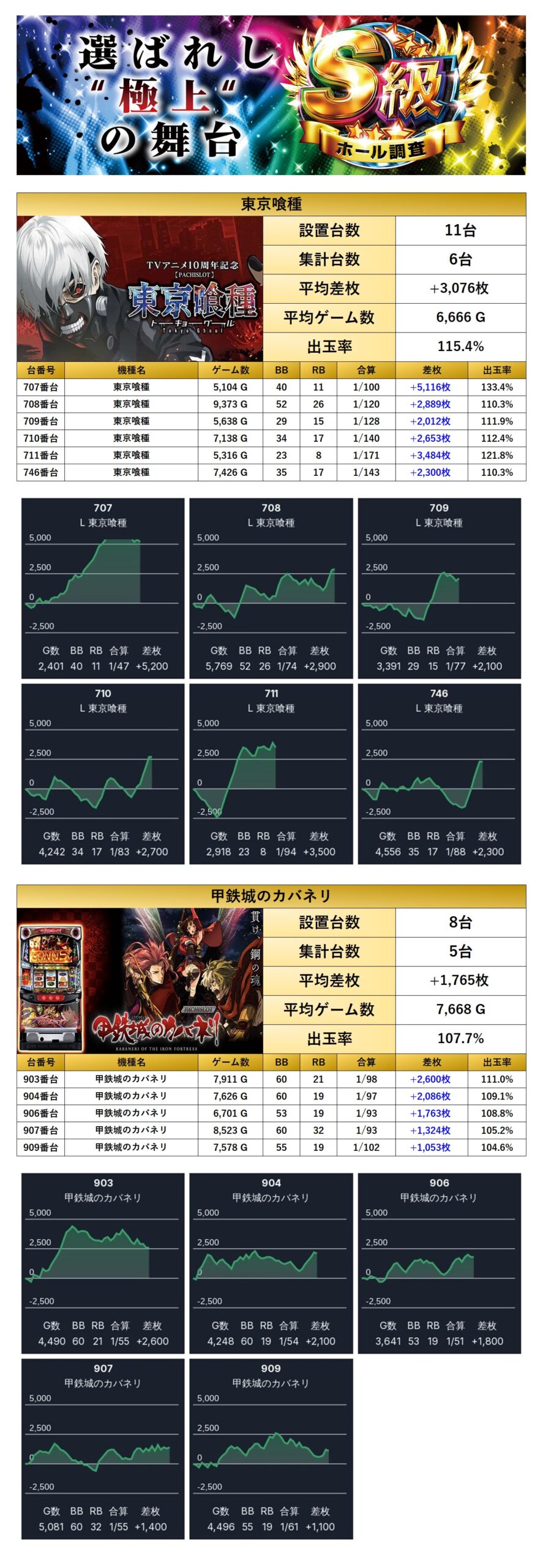 メイン機種でも紹介した「東京グール」「カバネリ」の2機種をpick upする。2機種11台の平均差枚は+2,480枚で平均出率が111.6%だった。