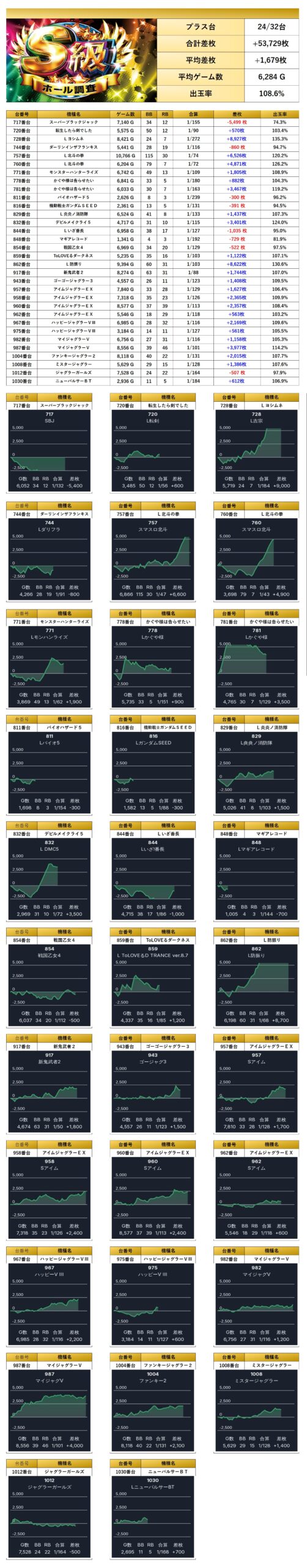 4台以上設置機種から優秀台を探すと32台をpick upすることができた。32台の平均差枚は+1,679枚で平均出率が108.6%だった。