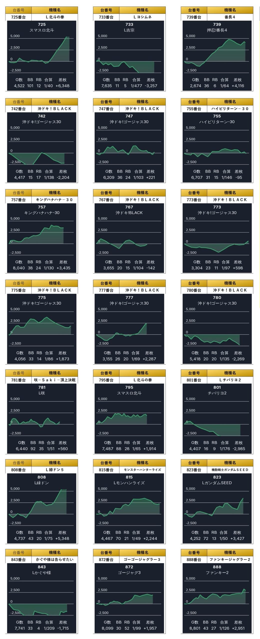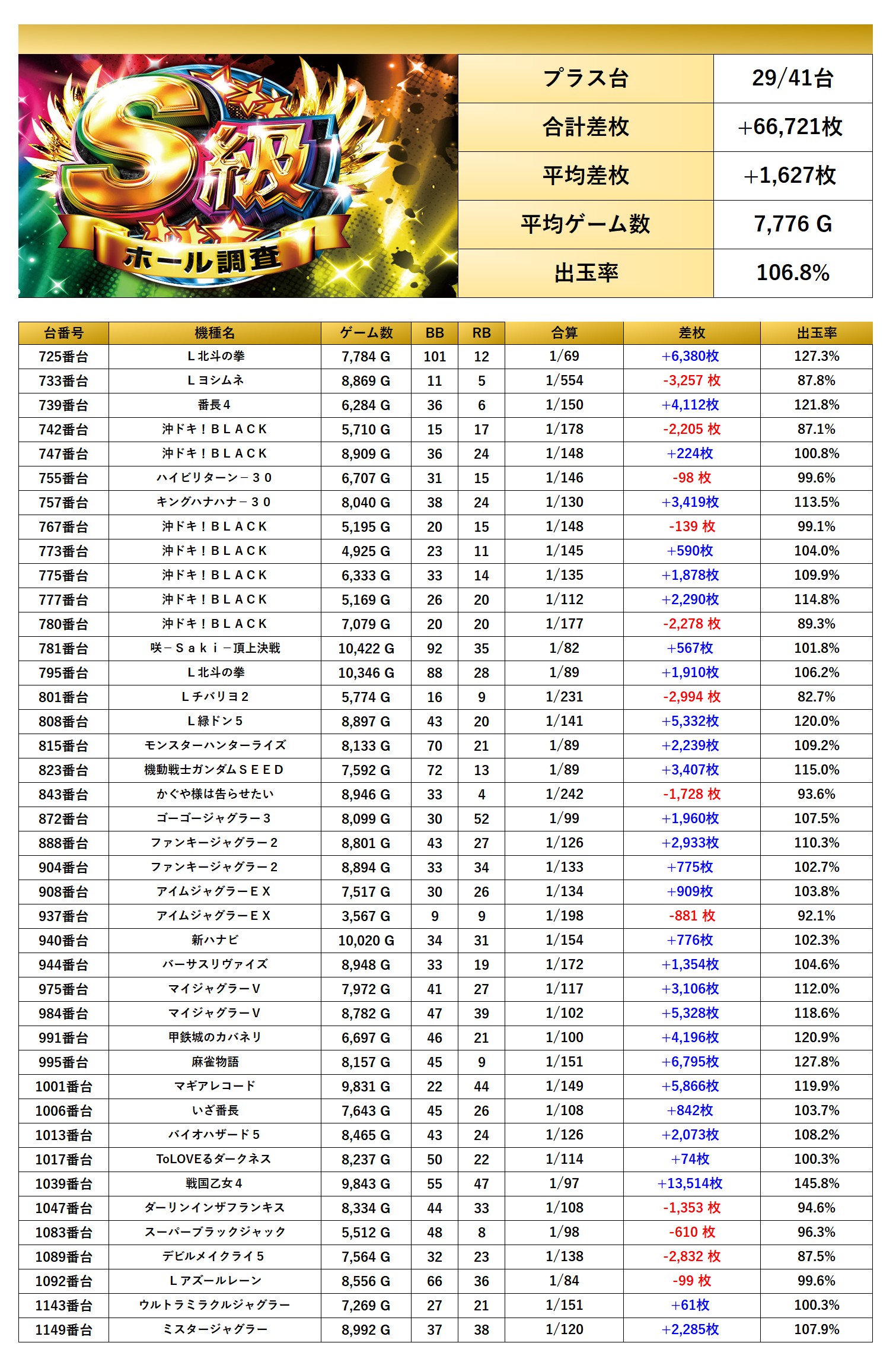 平均差枚+1,627枚、平均出率106.8%となった。41台もあるのに平均ゲーム数が7,500Gを超えてくるあたりを見ると質が高そうだ。