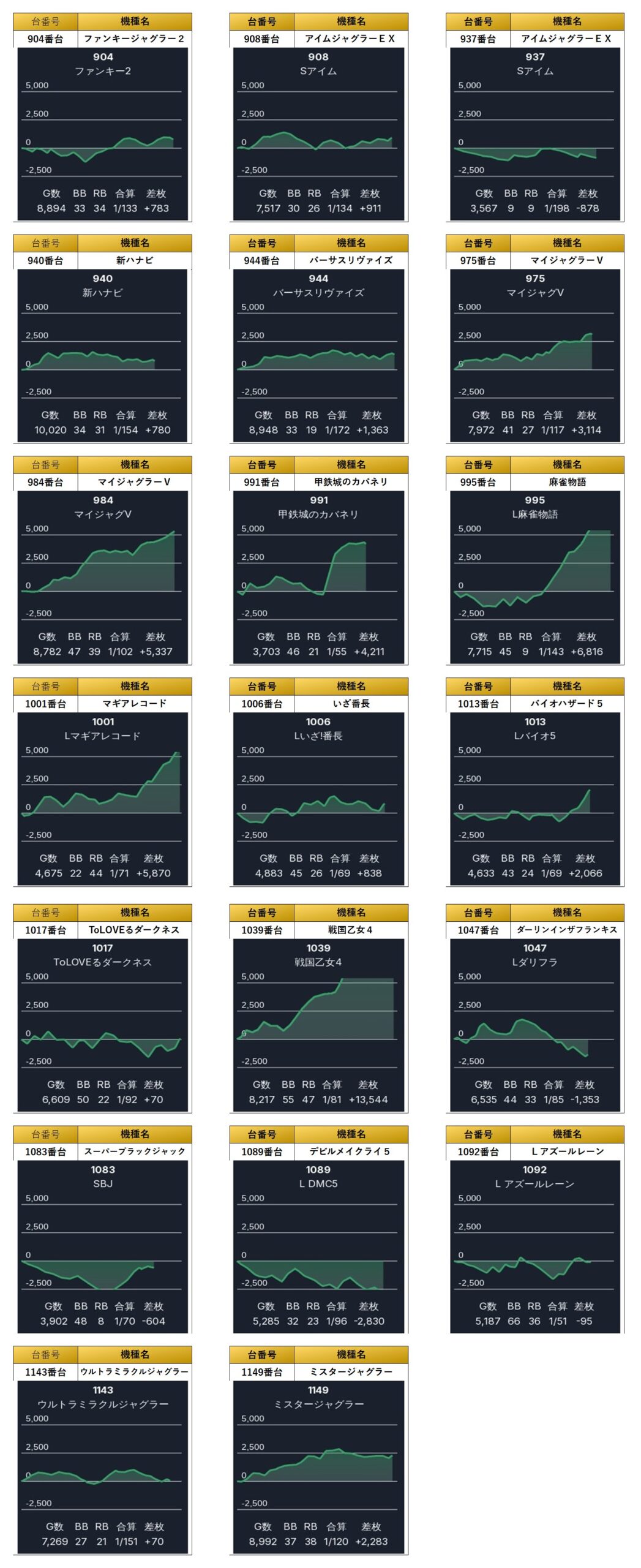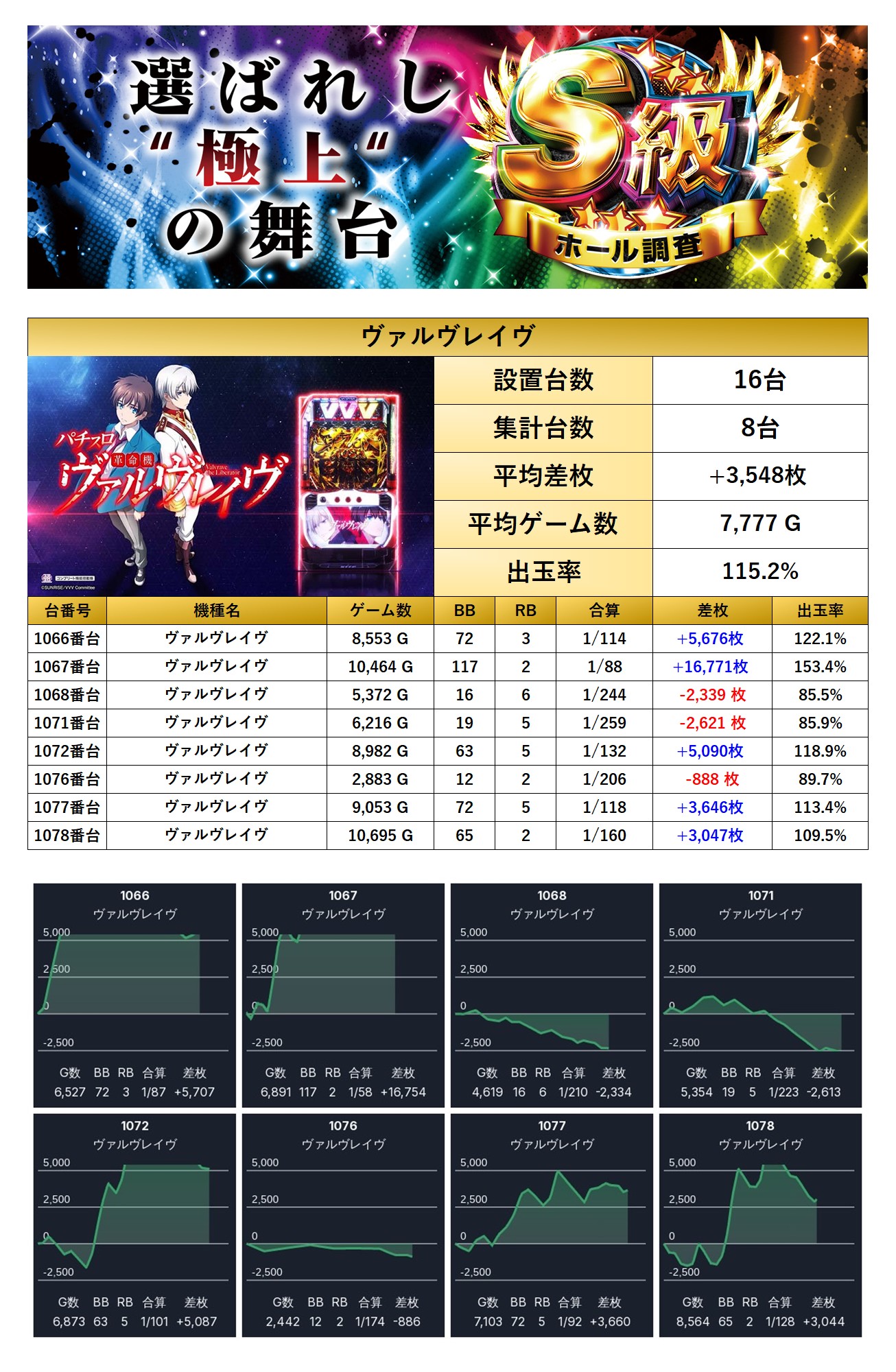 平均差枚+3,548枚、平均出率115.2%と、荒い機種ながらしっかり114.9%の出率は超えてきた。