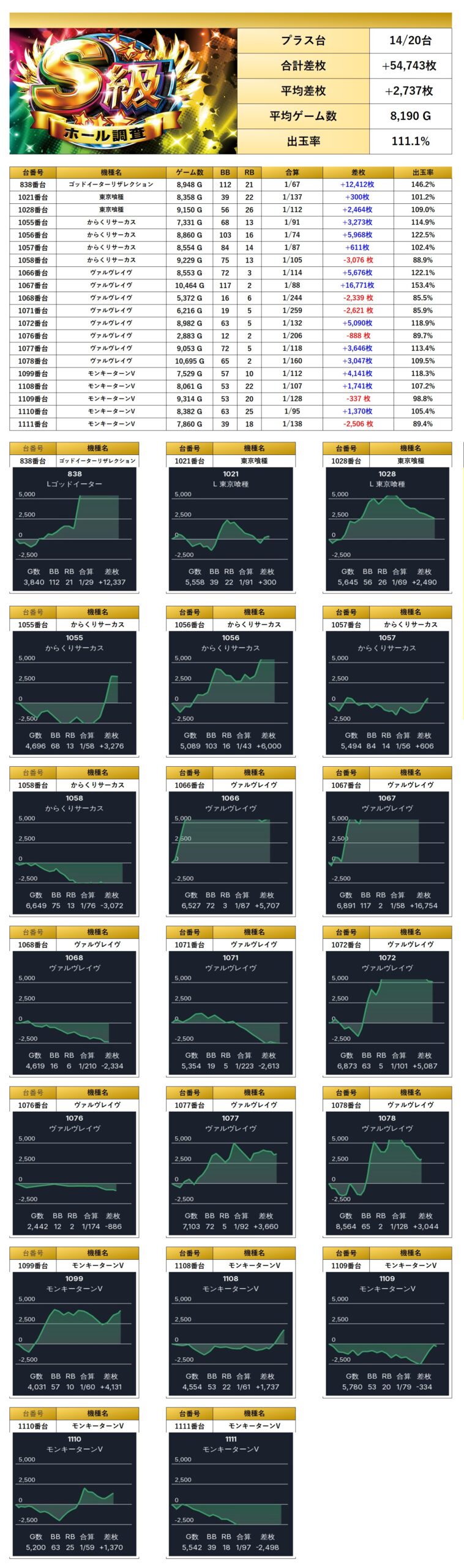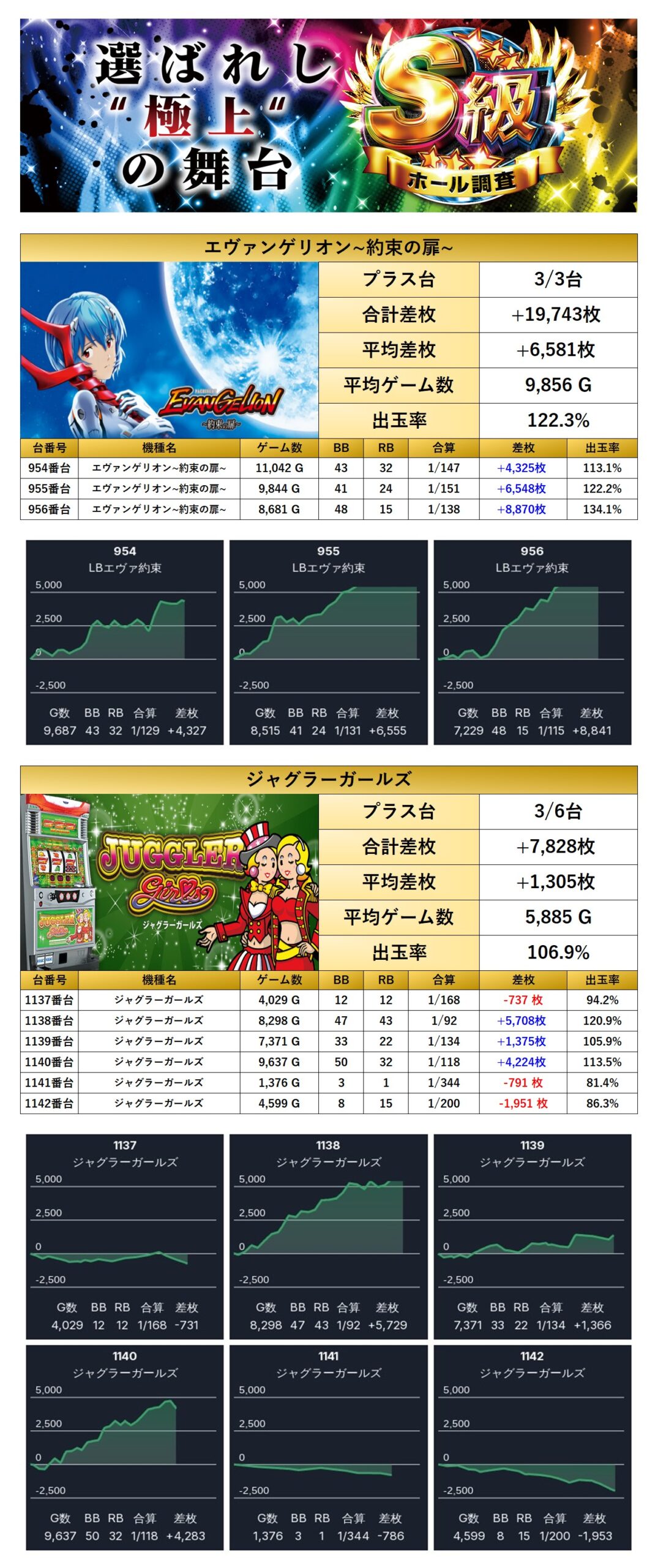 9回目となったS級虹で目を見張るのは「メイン機からの仕掛け」と「全台が好調だった機種」からエヴァの出率、更には「4台設置機種の仕掛け」の量の多さだろう。総差枚++61,671枚、台平均+142枚は分岐ラインに乗っていて素晴らしい。惜しいのは仕掛けの出率が108.8%と110%を割ってしまったのが残念である。総合加味して二ツ星評価となる。ただ、内容的には十分さを感じるので次回の開催も期待感がしっかり持てる。