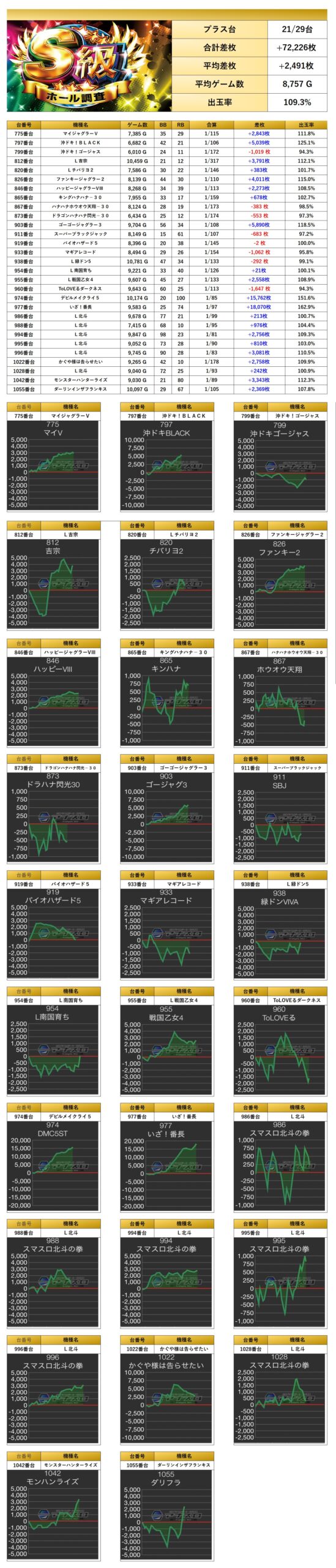 平均差枚+2,491枚、平均出率109.3%となった。単品で散っている台だが29台の平均ゲーム数が8,500Gを超えてくるのは質の高さがあってこそだろう。