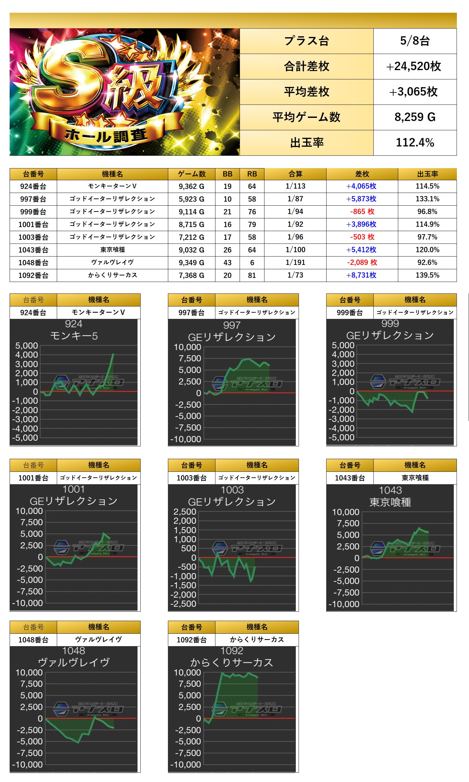 平均差枚+3,065枚、平均出率112.4%となった。全台ゲーム数がしっかり入り根拠をもって打てる状況にみえる。
