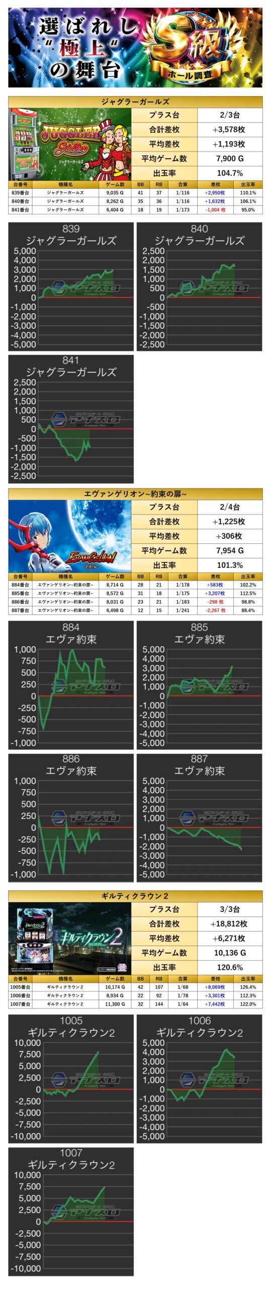 平均差枚+2,362枚、平均出率109.0%となった。ギルティクラウンは万回転にもなり平均出率も120%超えと素晴らしい結果だ。