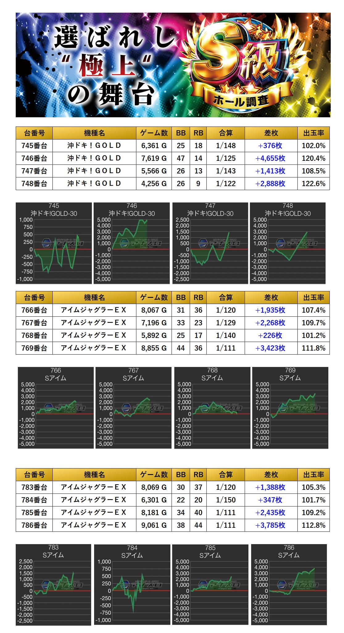 平均差枚+2,095枚、平均出率109.3%であった。12台全台でプラス差枚で対象機種の出率としては質がとても高い状況となった。