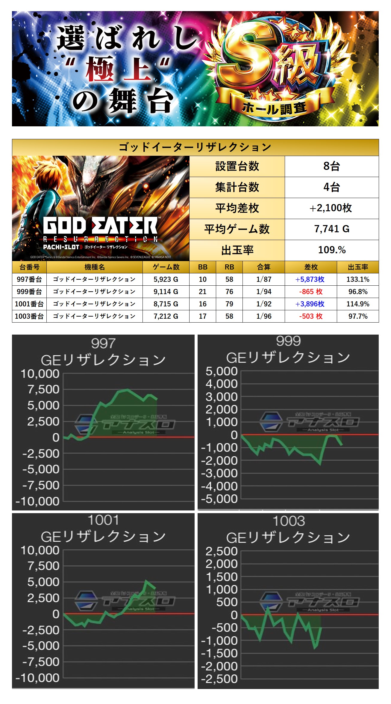 平均差枚+2,100枚、平均出率109.0%となった。ゴッドイーターでこれだけ回るのは追える状況があったのだろう。