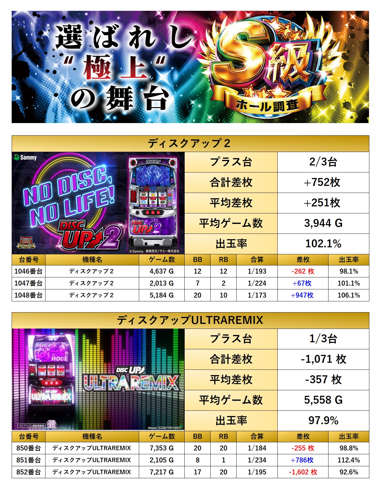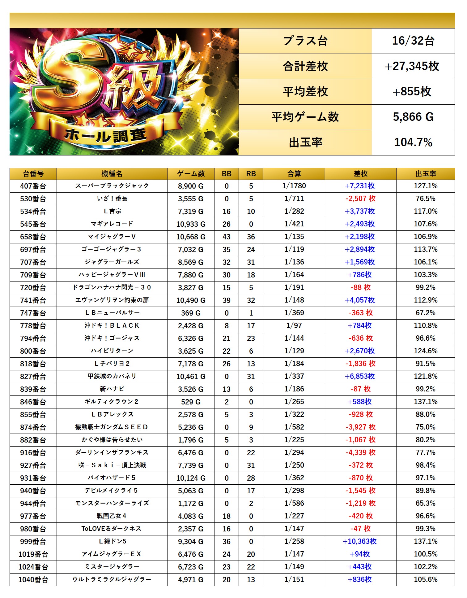 平均差枚+855枚、平均出率104.7%となった。仕掛け量がしっかり担保されている。