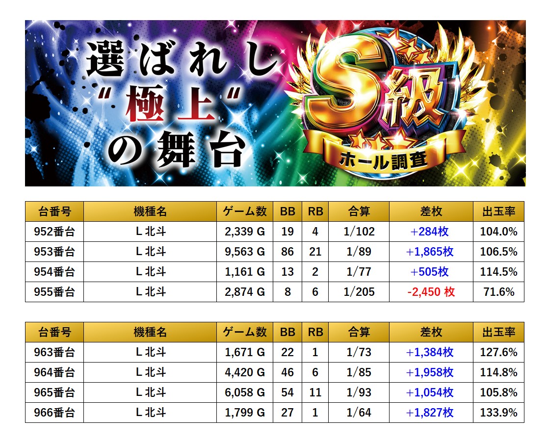 平均差枚+803枚、平均出率107.2%であった。仕掛け箇所が北斗にまとめられていた。