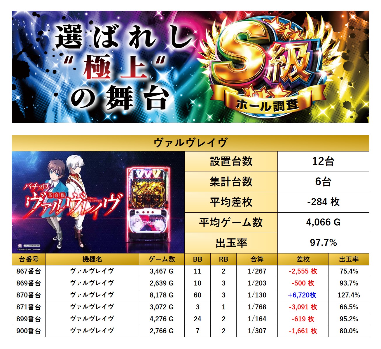 平均差枚-284枚、平均出率97.7%となった。もっと打ち込まれれば違った光景になったのかもしれない。
