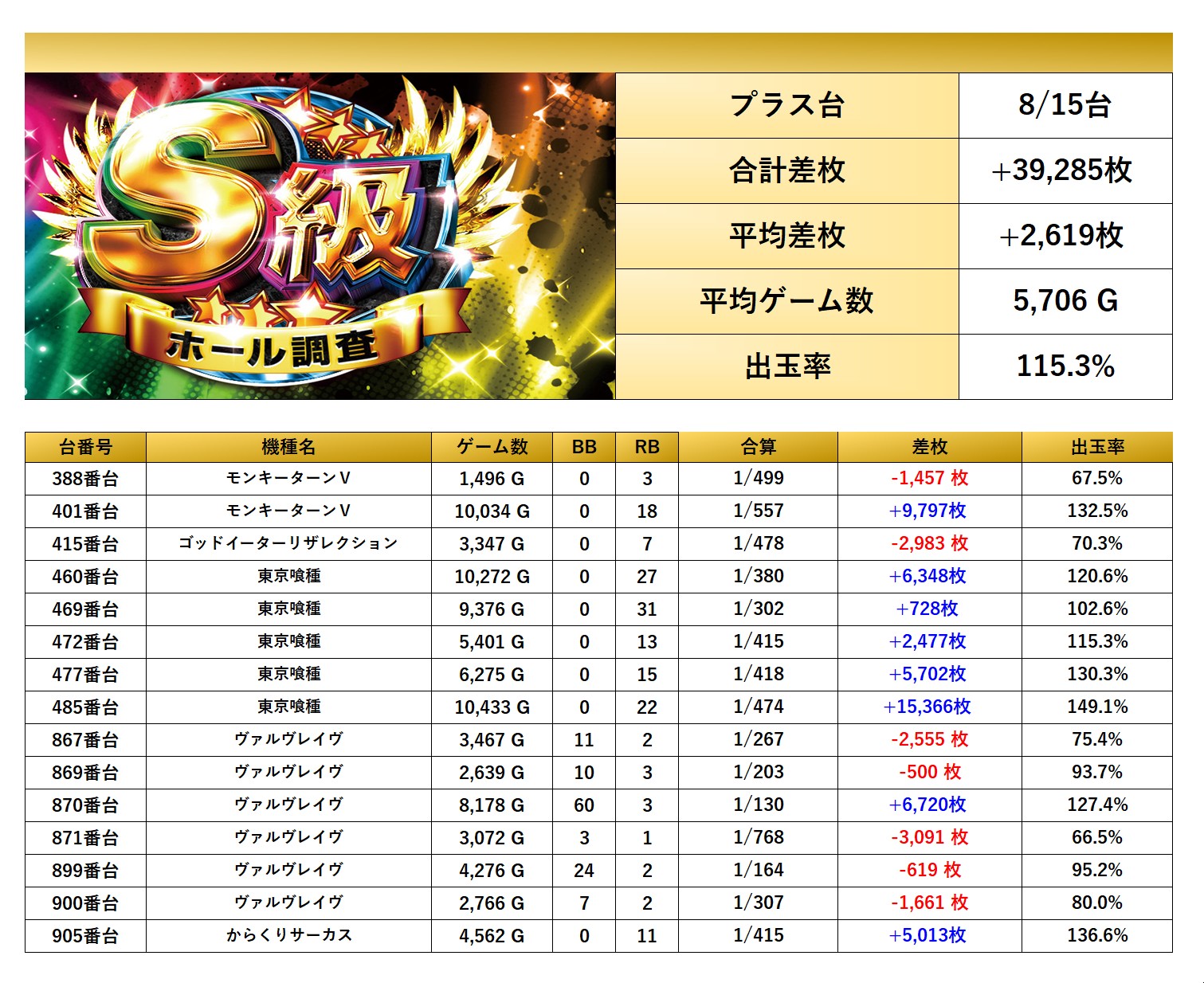 平均差枚+2,619枚、平均出率115.3%と、114.9%以上の数値を叩き出た!
