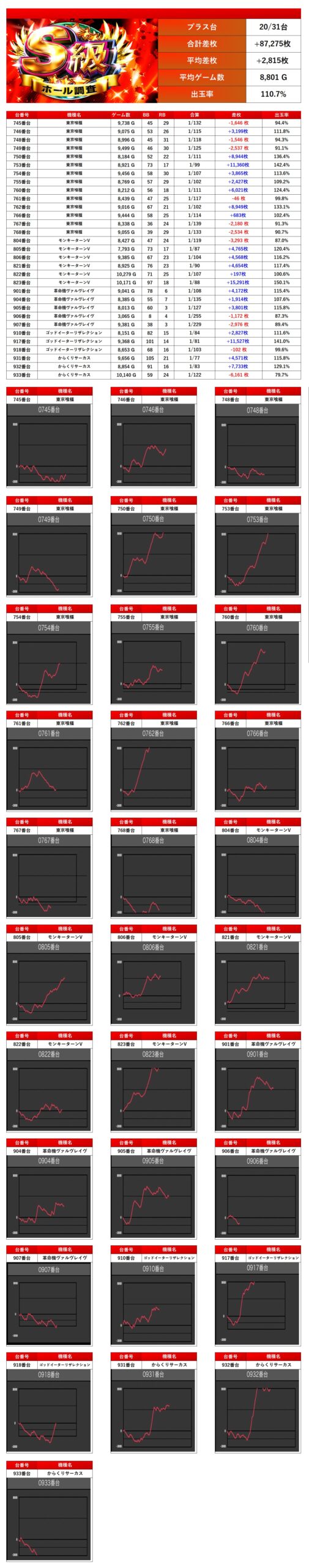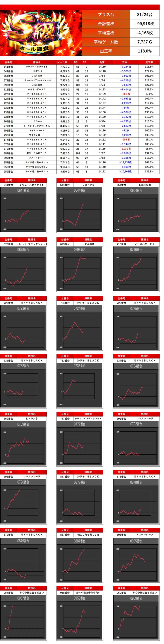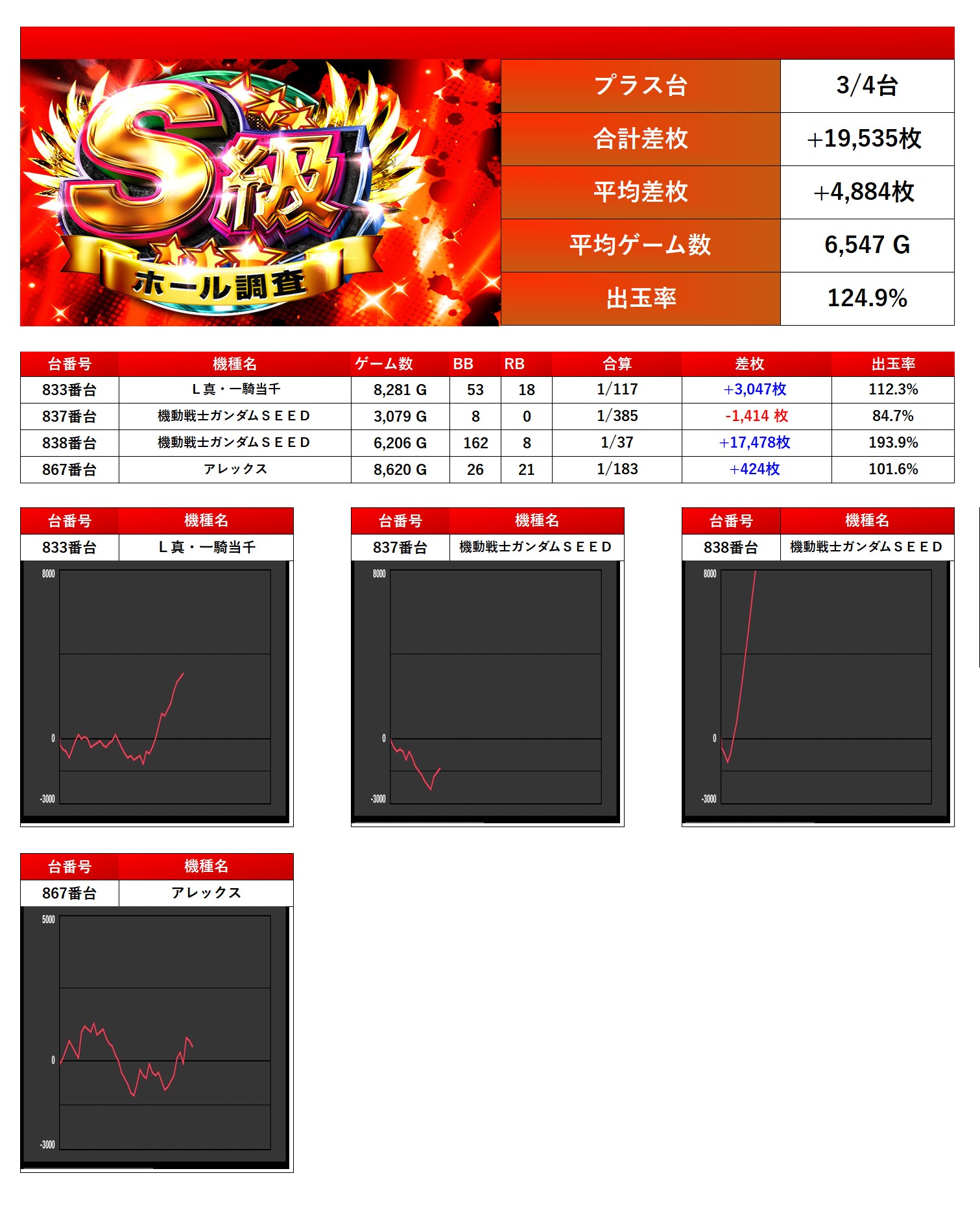 今回のS級ホール調査‐赤‐は、全体差枚+163,530枚/平均+345枚という堅実な数値を記録し、初開催を見事に成功へと導いた。