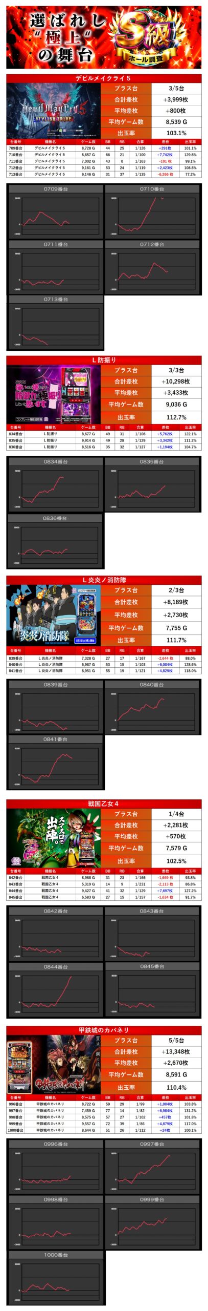 「デビルメイクライ5」「防振り」「炎炎ノ消防隊」「戦国乙女4」「甲鉄城のカバネリ」といった5機種がピックアップされ、平均差枚+1,906枚/出率107.6%をマーク。どの機種もまとまった出玉感を見せ、ホールの盛り上がりに大きく貢献した。