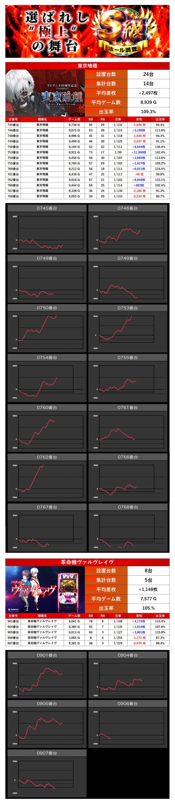 「東京喰種」「ヴァルヴレイヴ」の2機種から計20台がピックアップされ、平均差枚+2,142枚/出率108.3%を記録。特に一部台の爆発力が光り、存在感を放った。