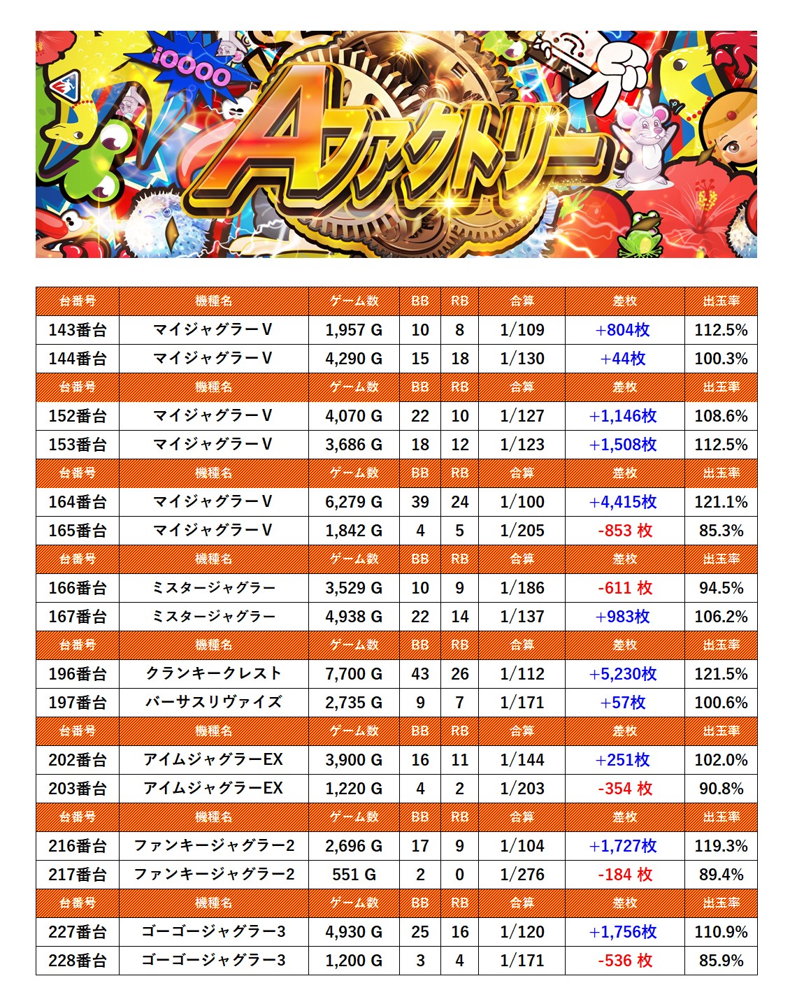 2台並びを7箇所14台をpick up。14台の平均差枚は+714枚で平均出率が104.4%だった。