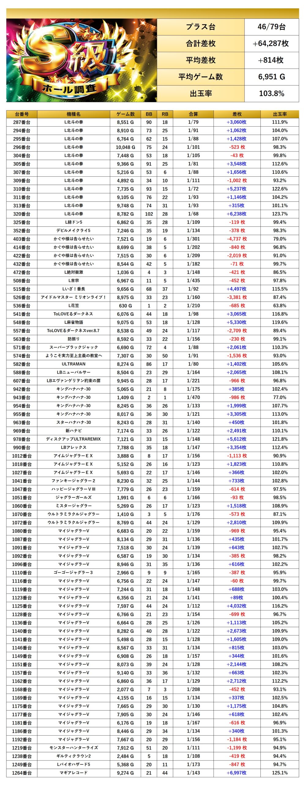 平均差枚+1,449枚、平均出率107.1%となった。こんな多台数機種がpick upされるのはマンモス店舗ならではだろう。