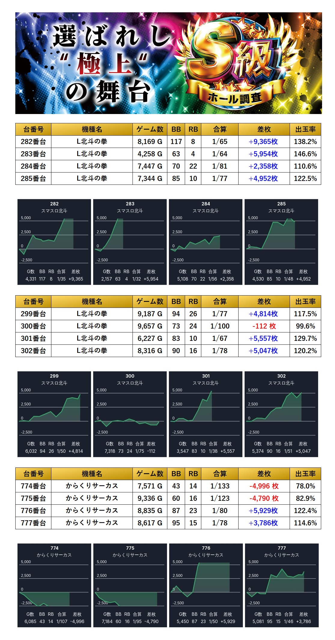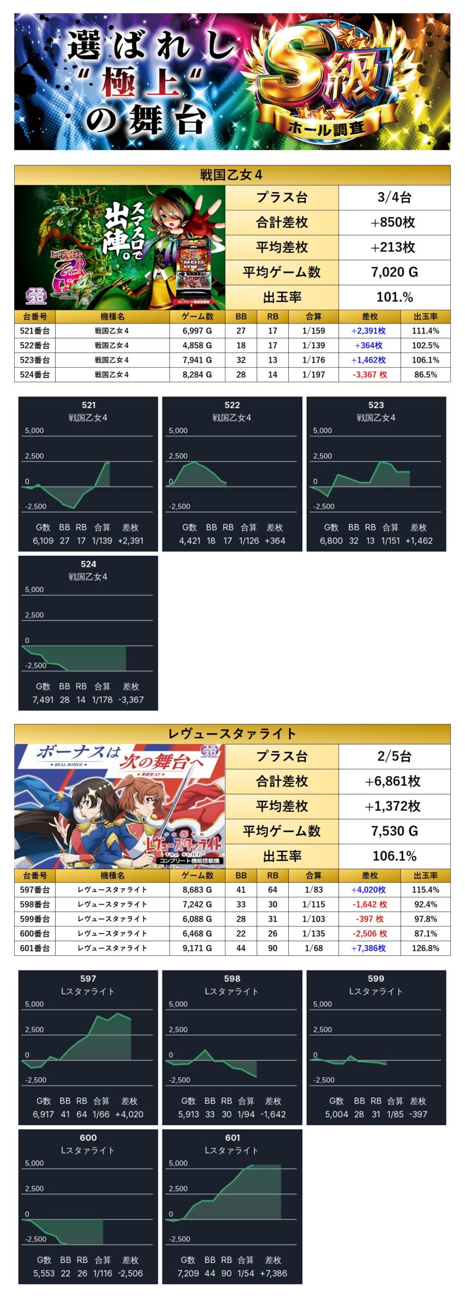 7回目となったS級虹では仕掛け量に着目してみよう。総pick up数で159台になりそれが各仕掛けに散らばるわけなのでどんな抽選番号でもチャンスがあった環境であった。スマスロ、ノーマル機それぞれから満遍なくpick upされている点も高評価だ。総合して二つ星評価となるが次回の開催も期待感がしっかり持てる内容であった。