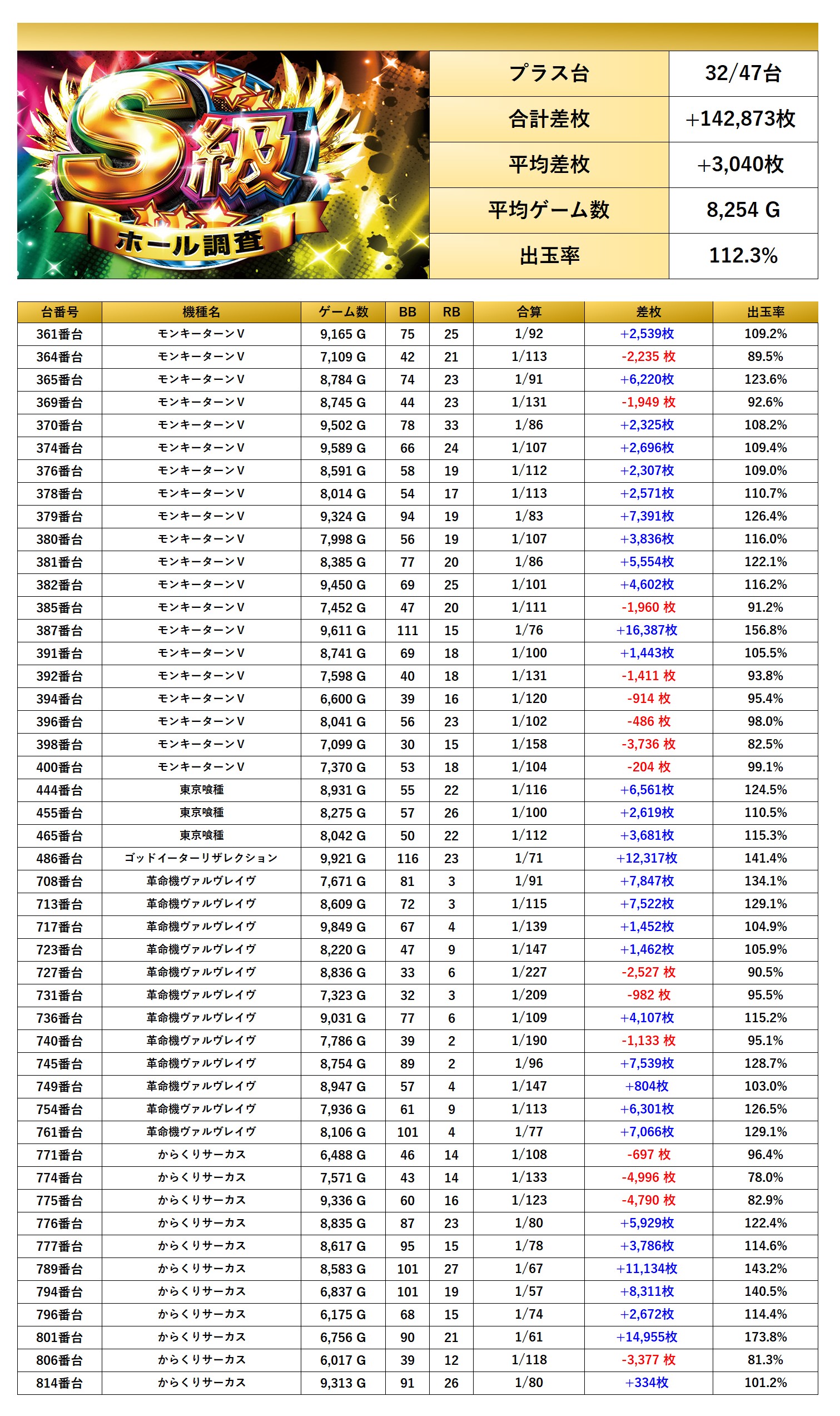 平均差枚+3,040枚、平均出率112.3%となった。平均ゲーム数が8,000Gを超え、ユーザーも確信が持てただろう。