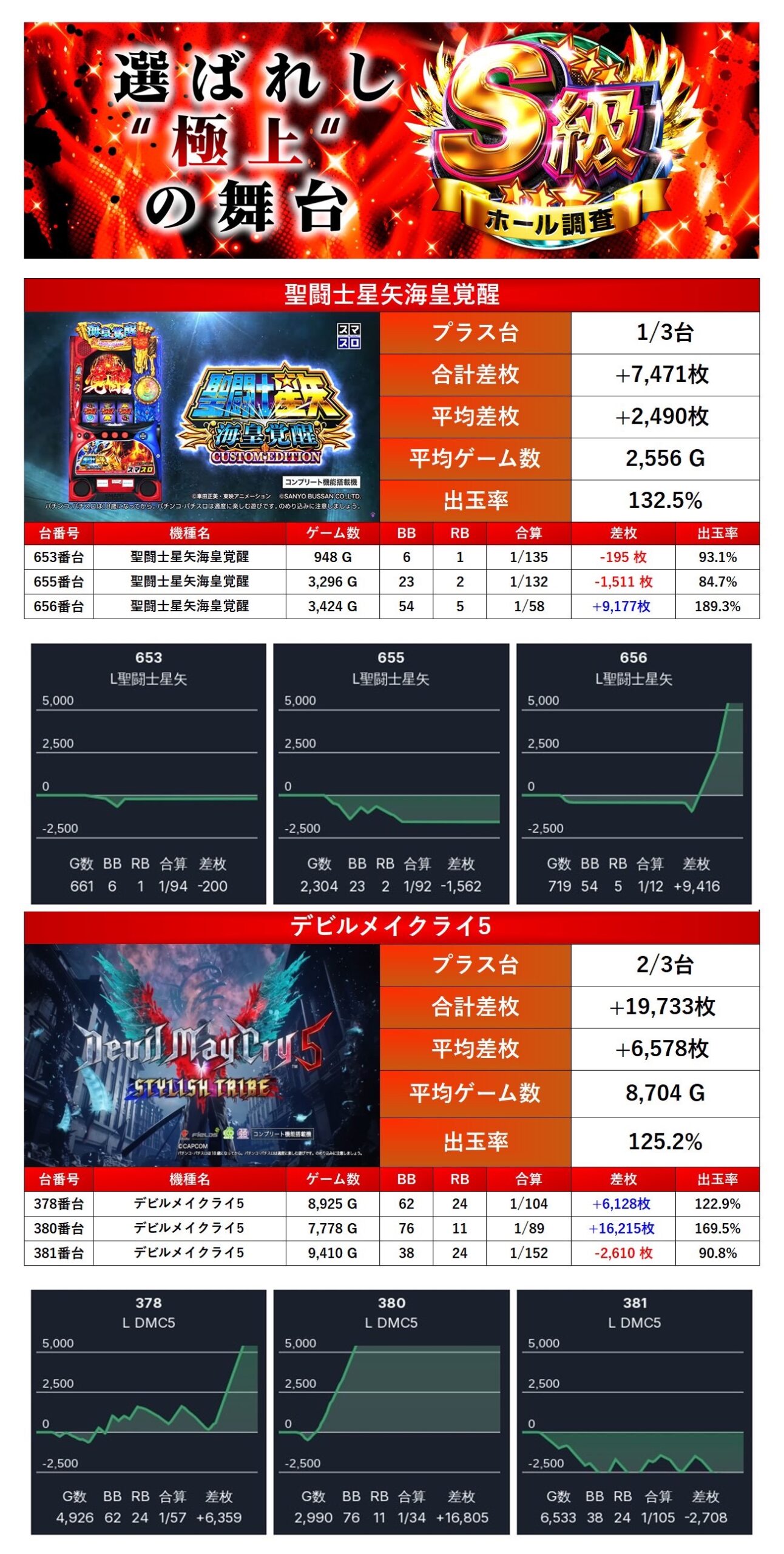 「聖闘士星矢」「デビルメイクライ5」では全台仕掛けが見られ、平均差枚+4,534枚・平均出率126.8%と力強い結果を記録。